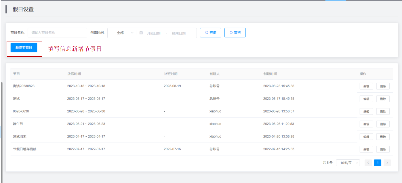 可以在假日设置上查询、筛选、新增、编辑节假日放假补班。
