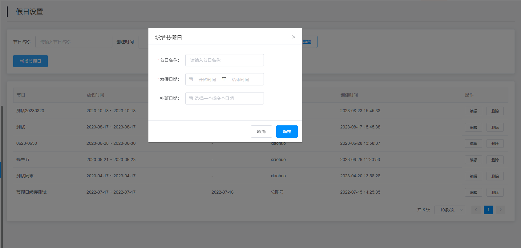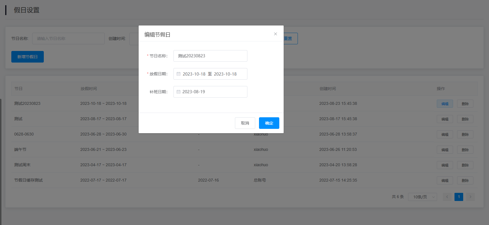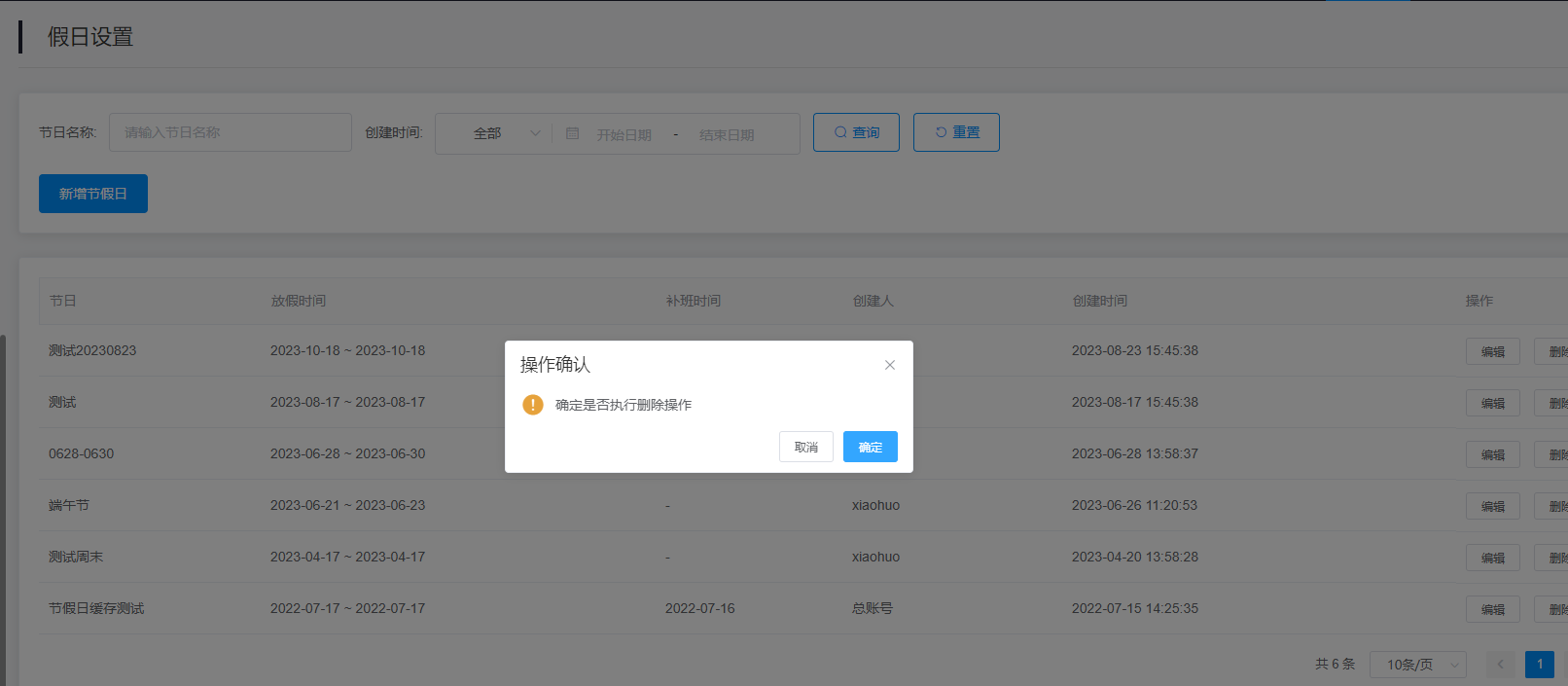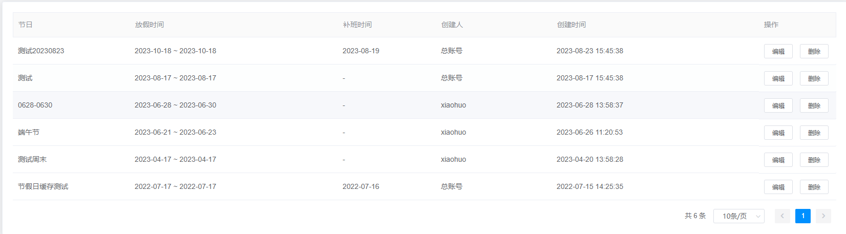 3.查询结果:该查询结果由节日、放假时间、补班时间、创建人、创建时间、操作(编辑、删除)组成。通过查询条件进行筛查节日信息查找。