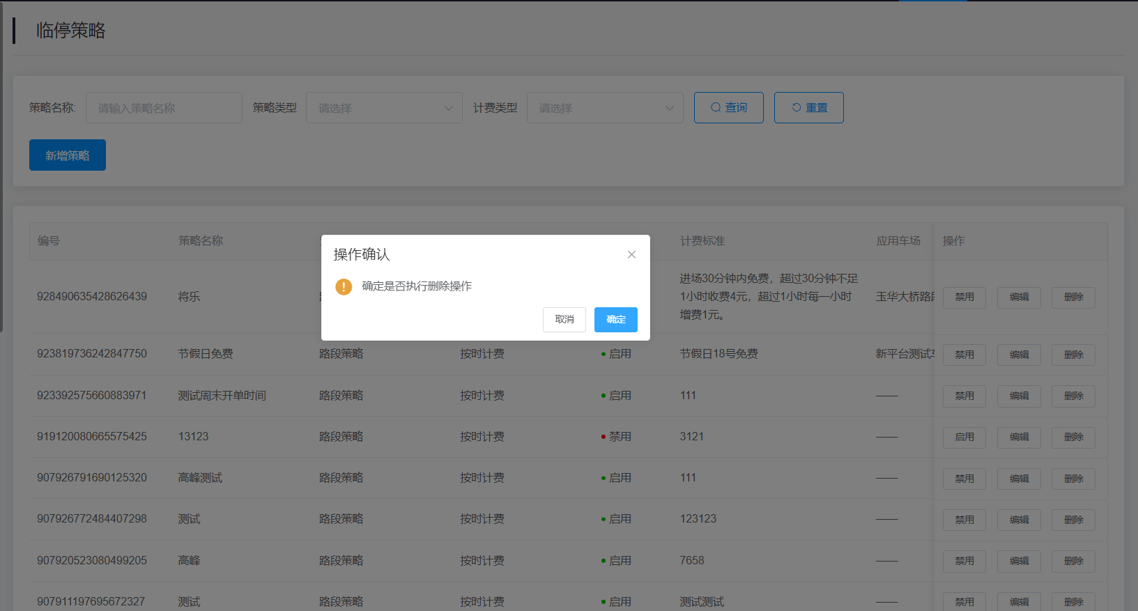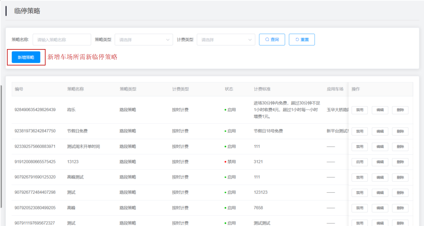 3.查询结果:该查询结果由编号、策略名称、策略类型、计费类型、状态、计费标准、应用车场、创建人、创建时间、操作(禁用/启用、编辑、删除)组成。通过查询条件进行筛查临停策略信息查找。