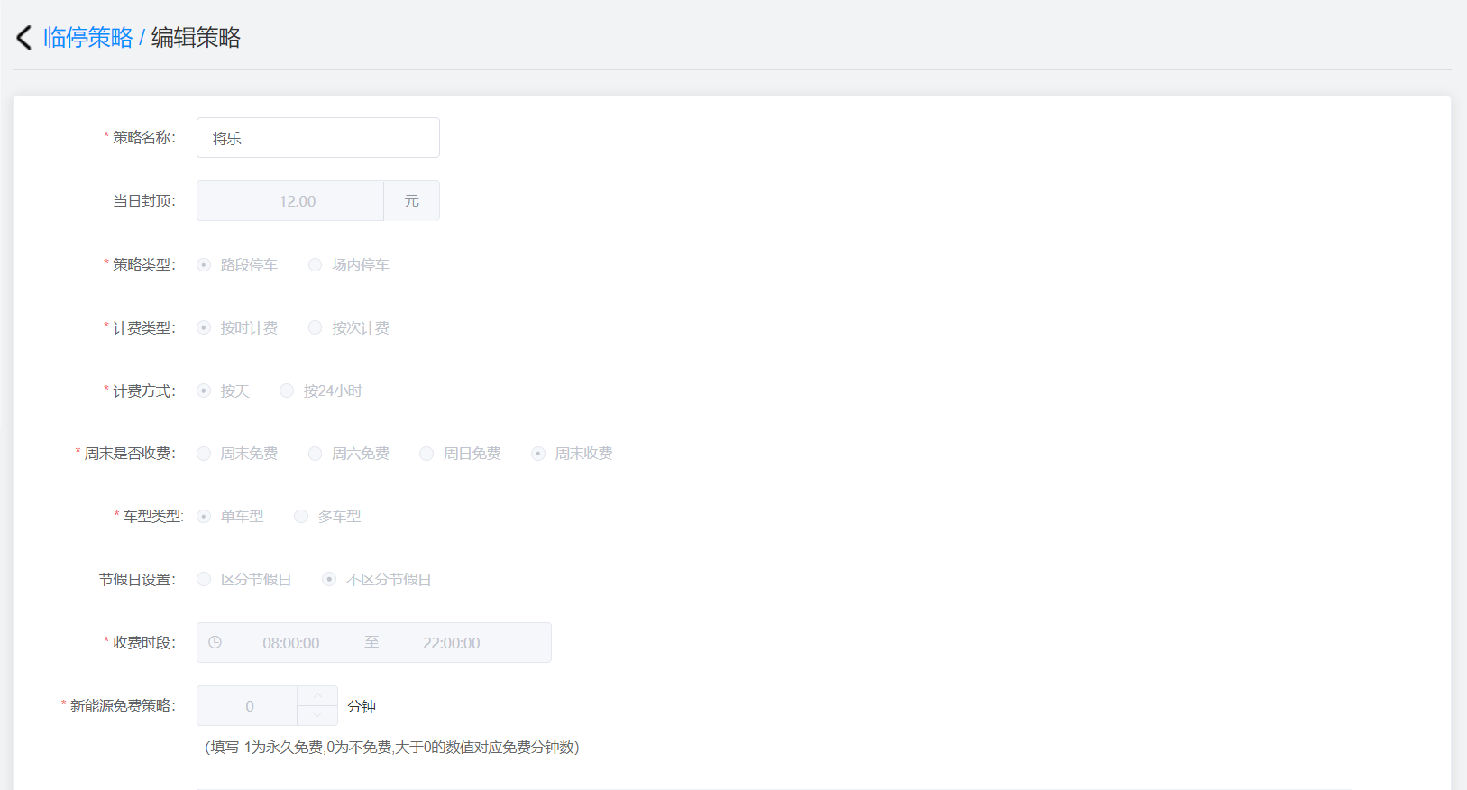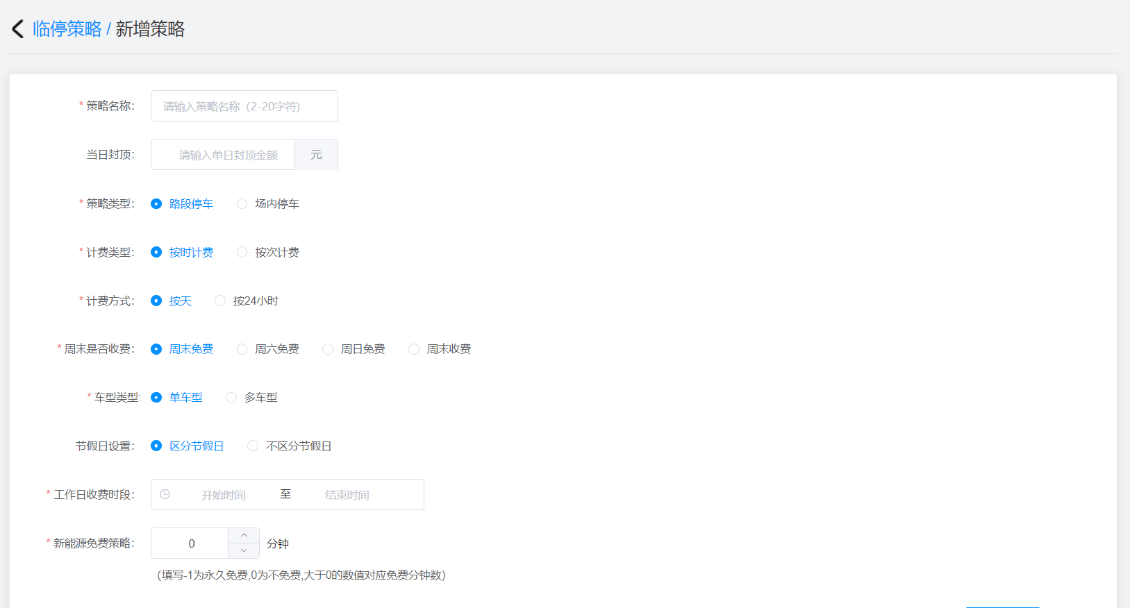 策略类型:可分为路段策略、场内策略,可通过选择其中任一状态进行临停策略信息筛查;