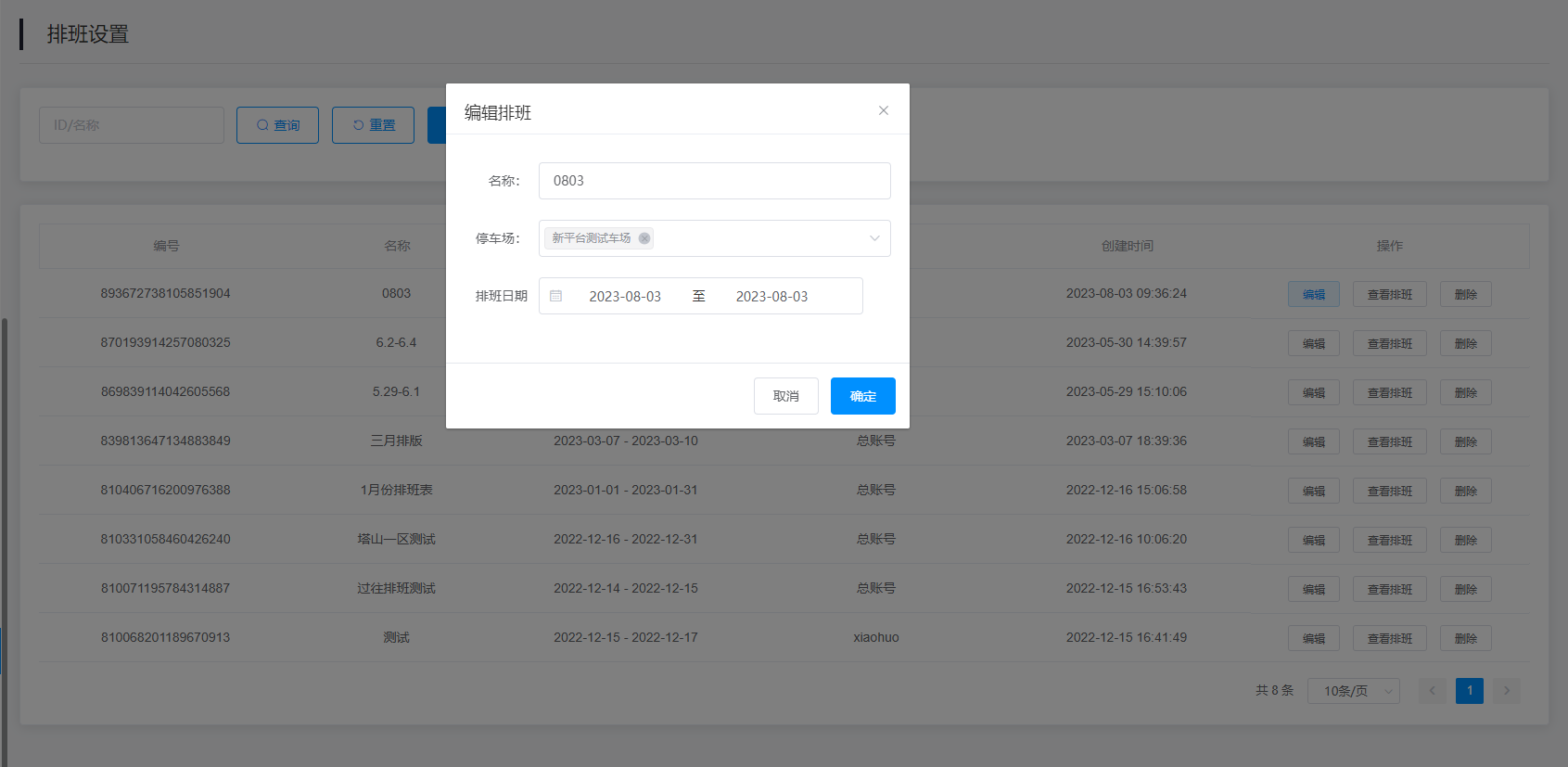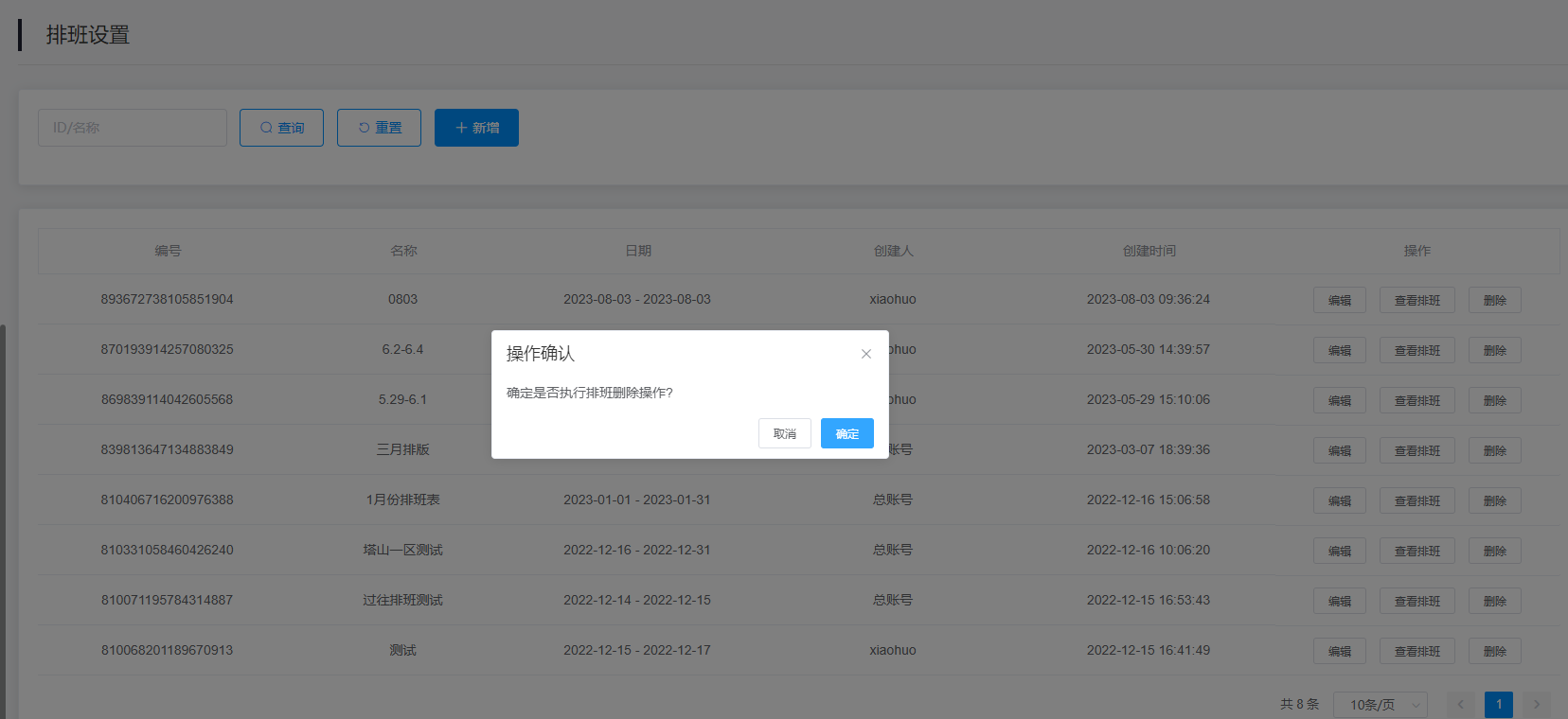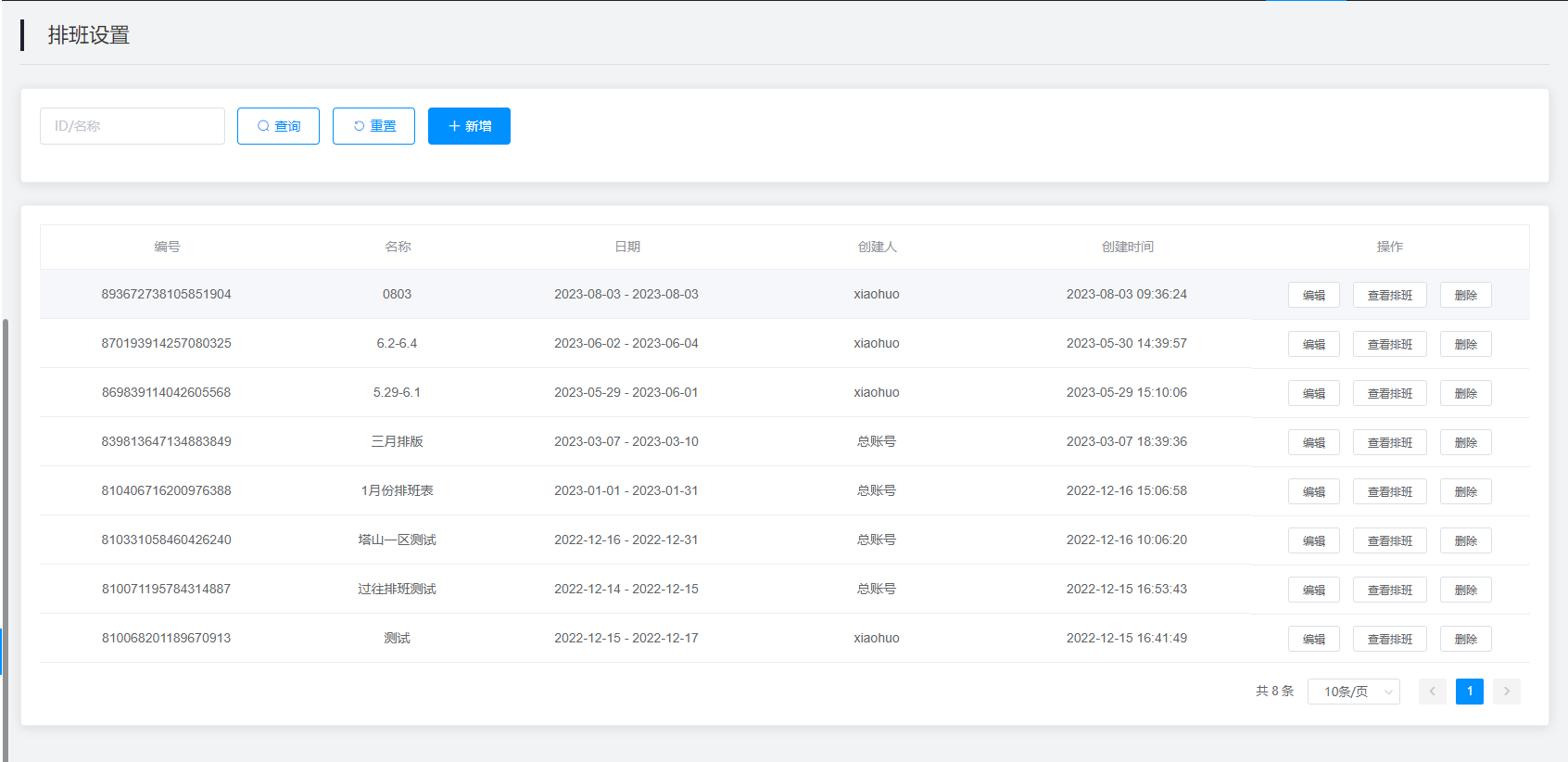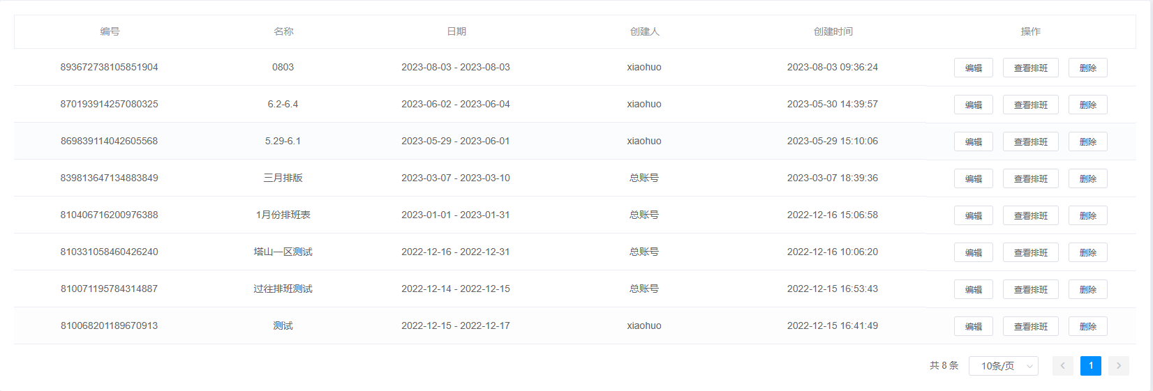 3.查询结果:该查询结果由编号、名称、日期、创建人、创建时间、操作(编辑、查看排班、删除)组成。通过查询条件进行排班管理。