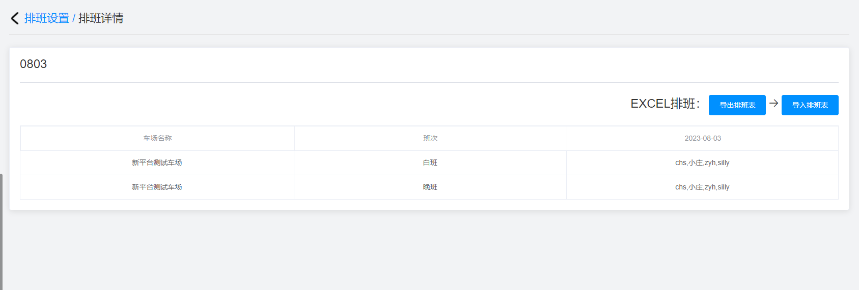 查看排班:点击查询结果右侧的“查看排班”按钮即可进入排班页面,该排班表由excel导入,也可导出该排班表。