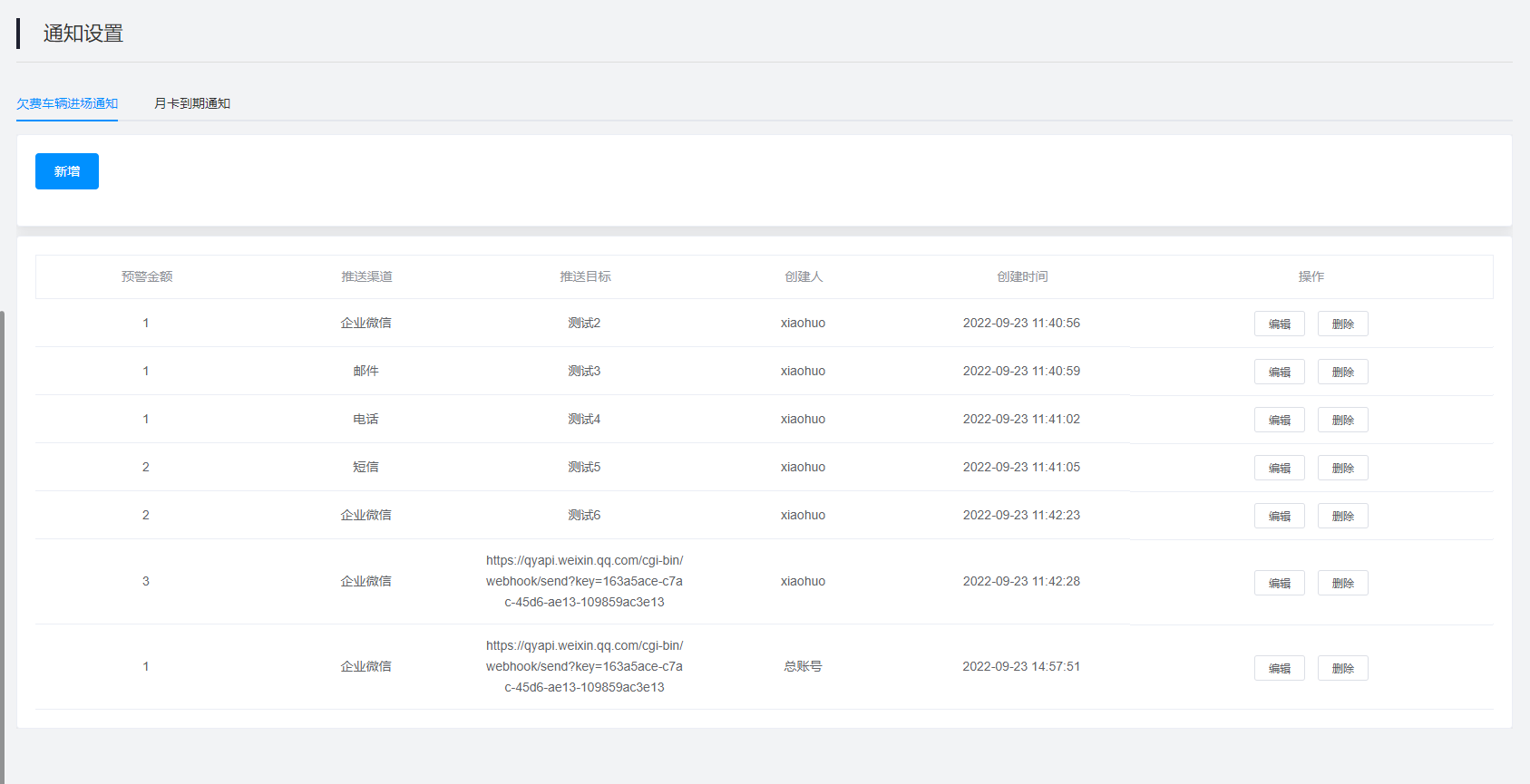 可以在通知上设置欠费车辆进场通知、月卡到期通知。