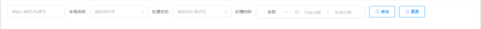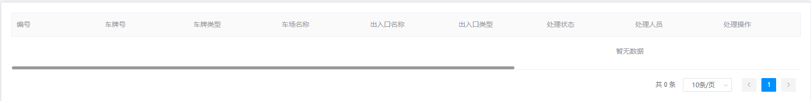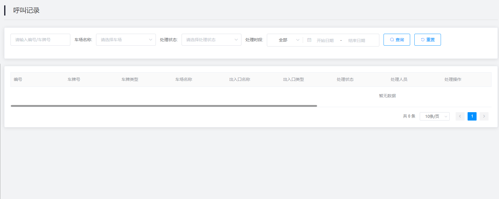 2.查询结果:该查询结果由编号、车牌号、车牌类型、车场名称、出入口名称、出入口类型、处理状态、处理人员、处理操作组成。通过查询条件进行筛查呼叫记录查找。