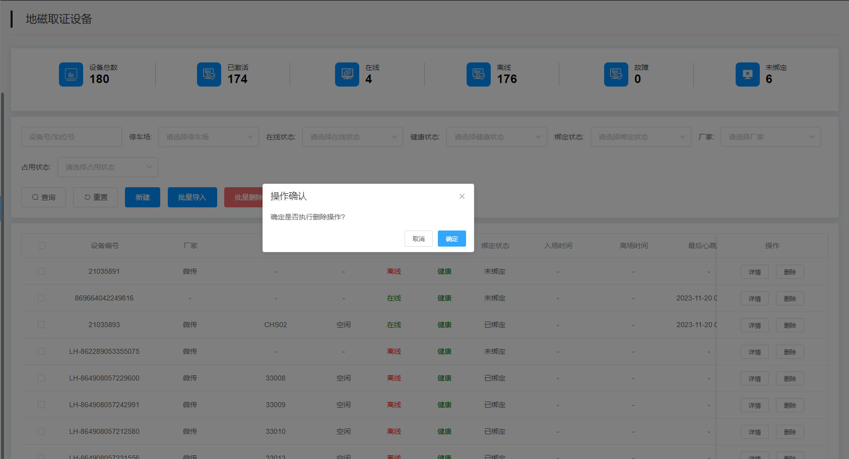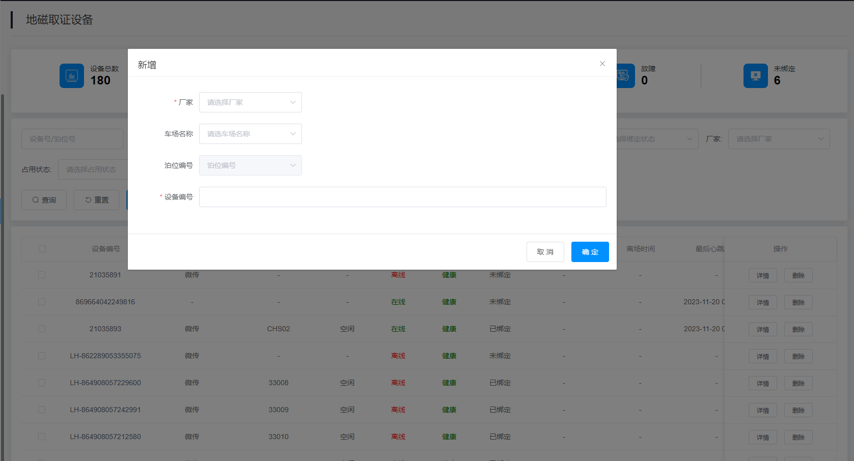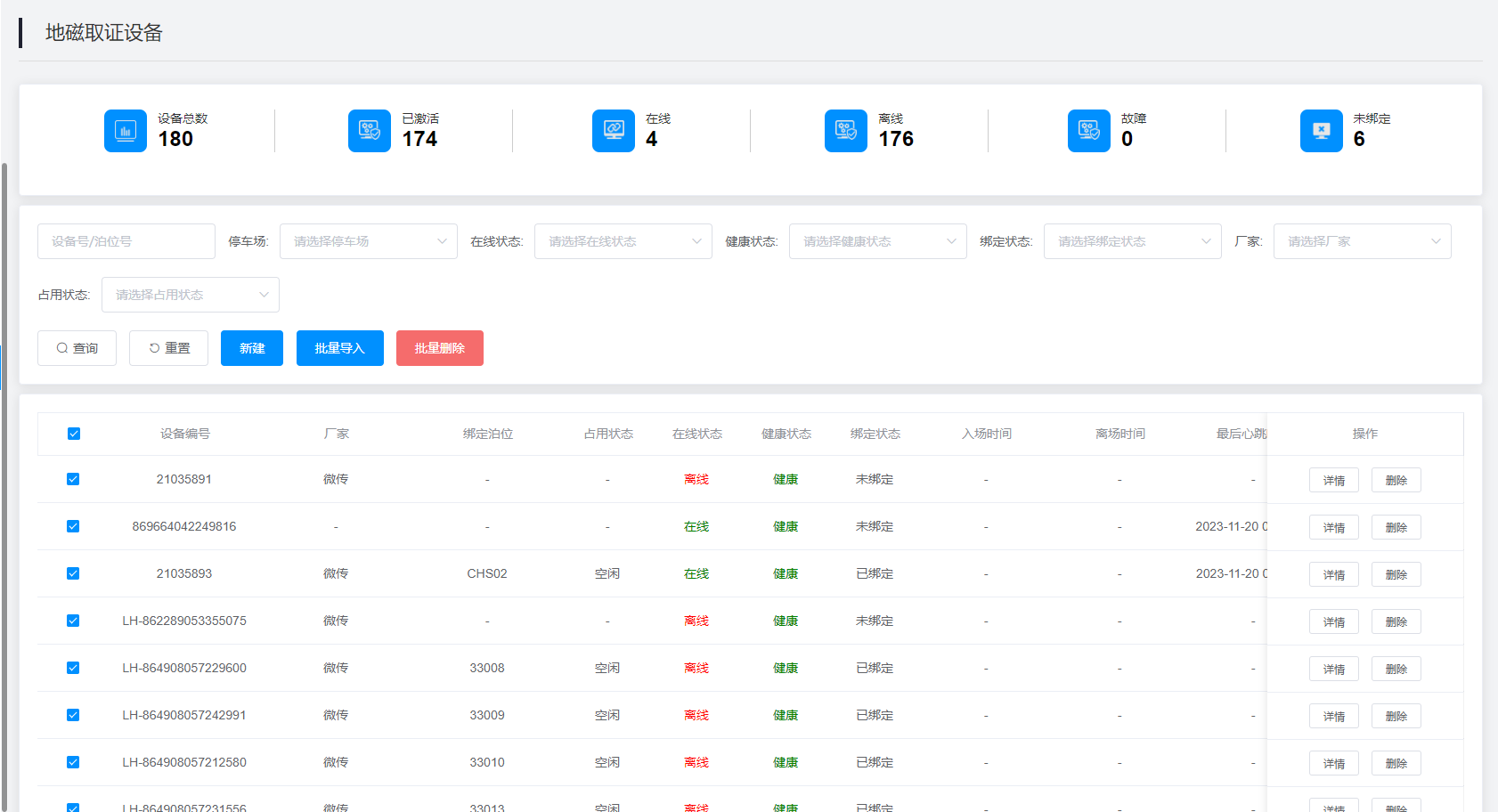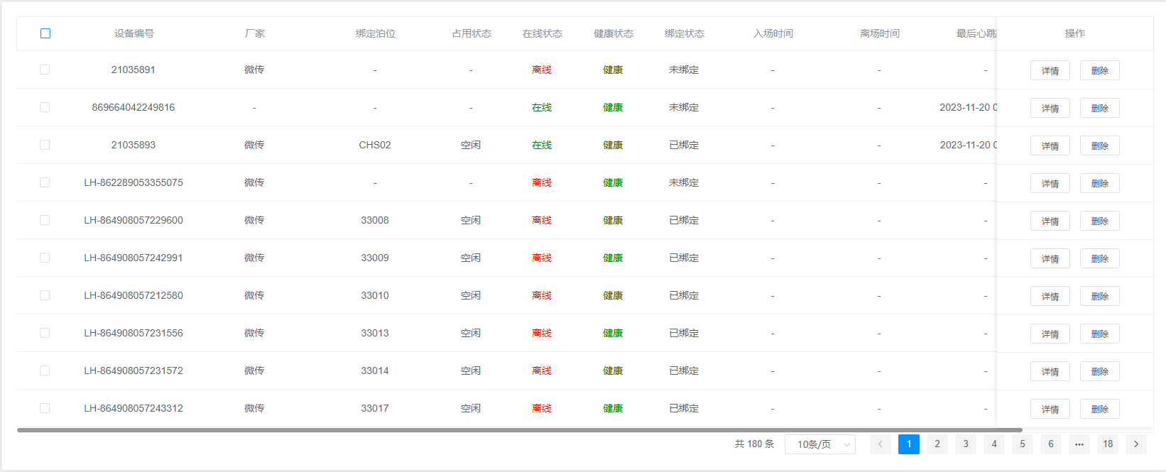 2.查询结果:该查询结果由设备编号、厂家、绑定泊位、占用状态、在线状态、健康状态、绑定状态、入场时间、离场时间、最后心跳时间、车场名称、操作组成。通过查询条件进行筛查地磁设备信息查找。