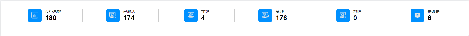数据统计概况:该数据统计分别为设备总数、已激活、在线、离线、故障、未绑定。