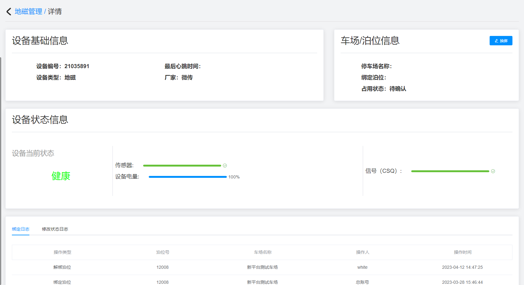 详情:点击查询结果右侧的“详情”按钮可以查看该地磁设备的基础信息、车场/泊位信息和状态信息,点击车场/泊位信息右上角“换绑”按钮即可选择车场和泊位重新换绑。