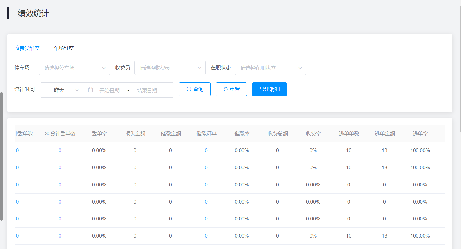 可以在绩效统计上查询、筛选到所有停车场收费员绩效统计详情。