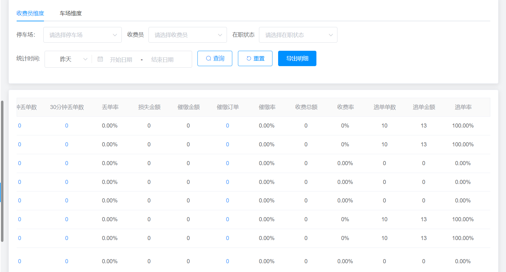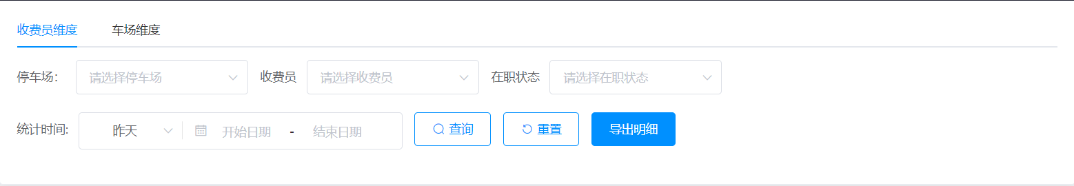 停车场:可通过选择车场类型和车场名单进行收费员绩效筛查;
