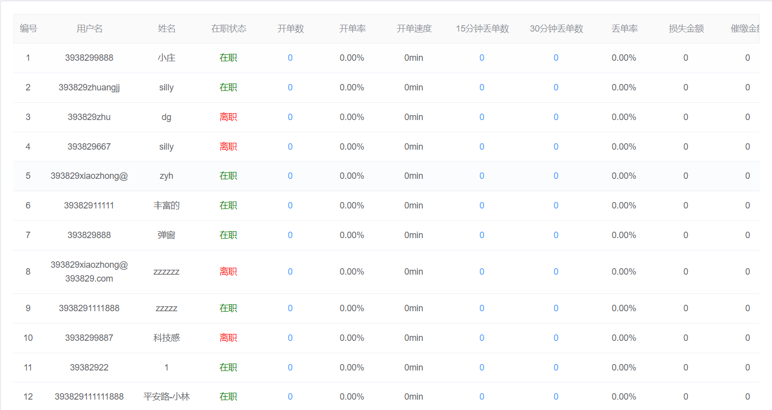 2.查询结果:该查询结果由编号、用户名、姓名、在职状态、开单数、开单率、开单速度、15分钟丢单数、30分钟丢单数、丢单率、损失金额、催缴金额、催缴订单、催缴率、收费总额、收费率、逃单单数、逃单金额、逃单率、考勤异常、信息采集、未处理工单、未通过审核订单组成。通过查询条件进行筛查收费员绩效查找。