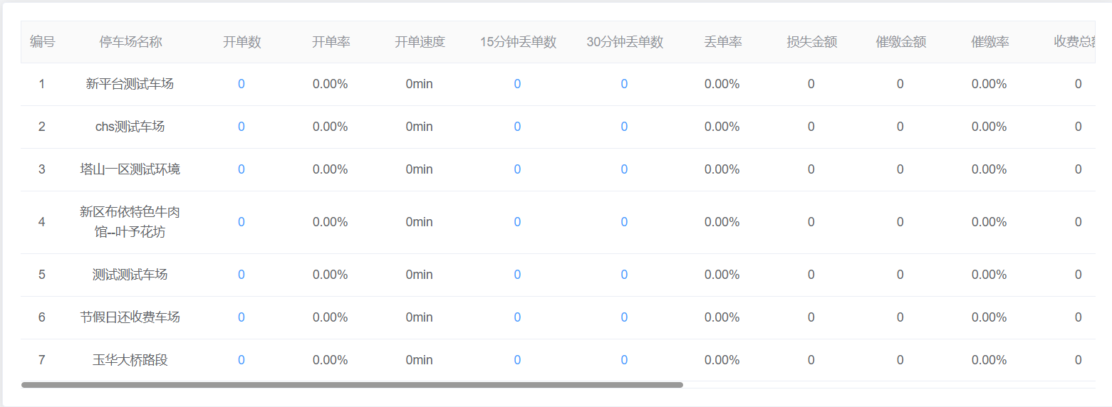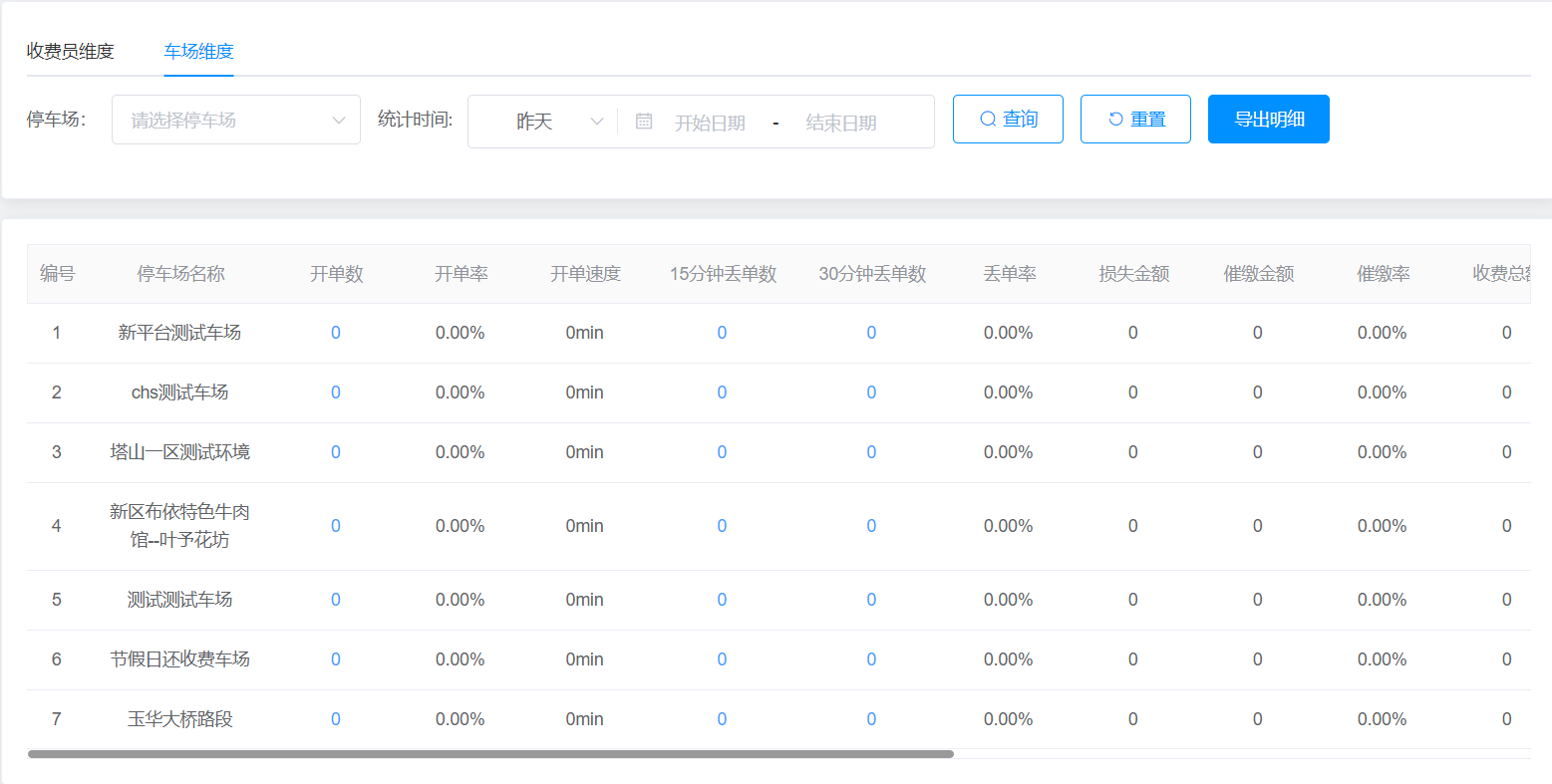 统计时间:可通过选择统计时间段进行停车场绩效筛查。