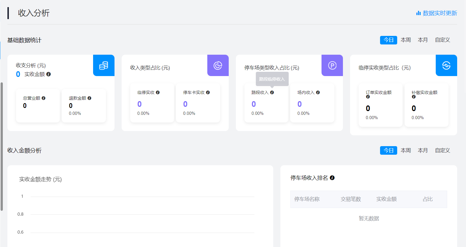 可以在收入分析上查看到基础数据统计、收入金额分析、订单金额与笔数分析、逃单统计的数据分析详情。