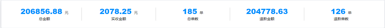 2.数据统计概况:该数据统计分别为总金额、实收金额、总单数、退款金额、退款单数。