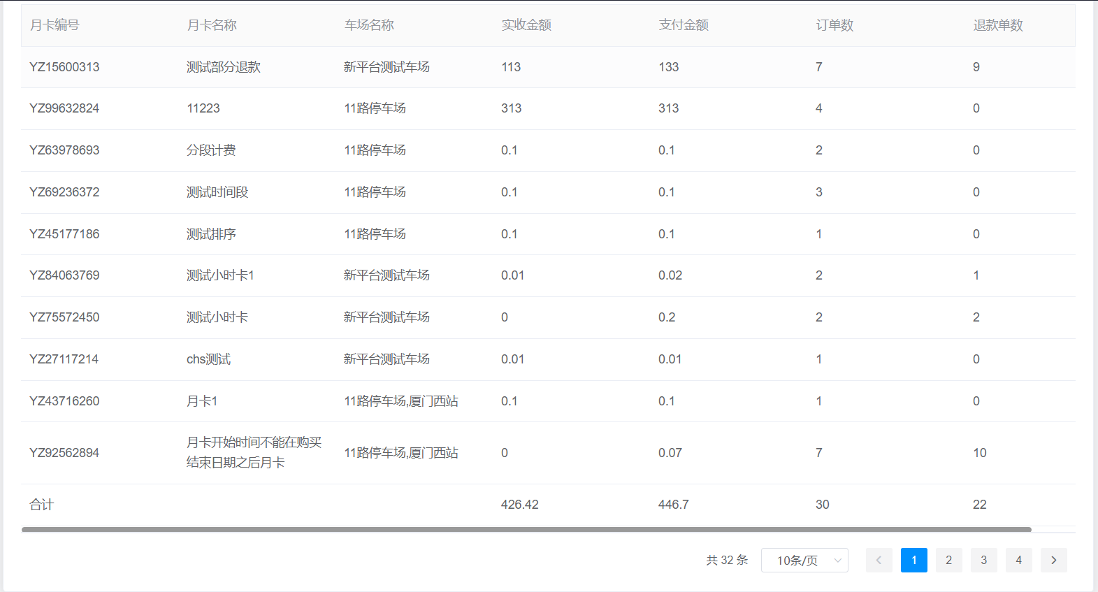 3.查询结果:该查询结果由月卡编号、月卡名称、车场名称、实收金额、支付金额、订单数、退款单数。