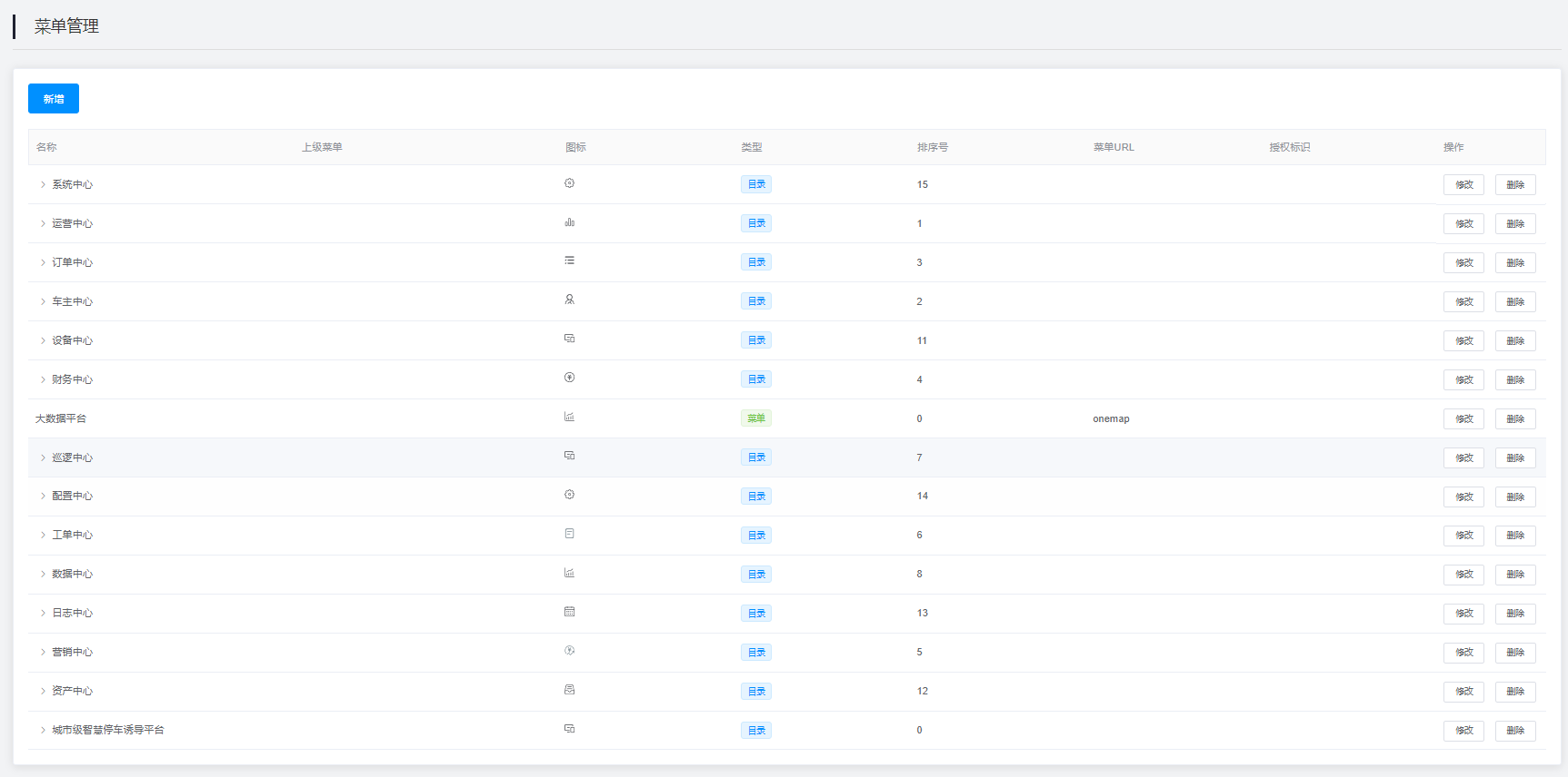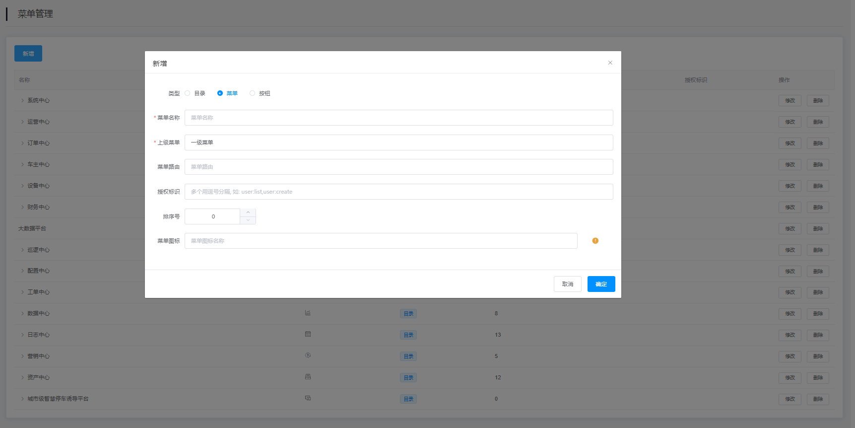 新增:点击左上角的“新增”按钮即可选择菜单类型、填写信息进行新增菜单。