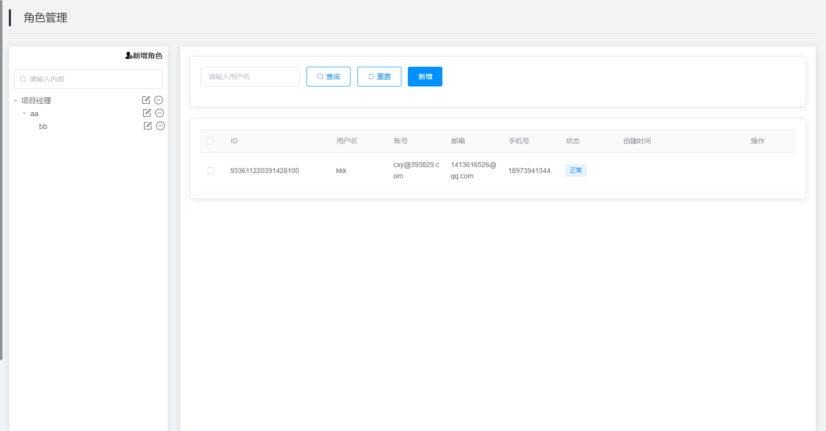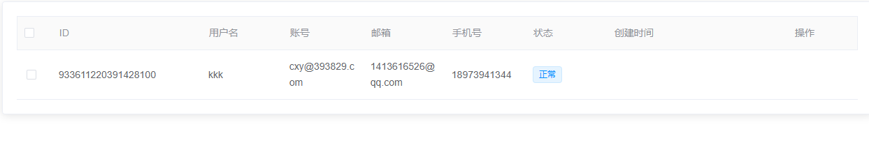 4.查询结果:该查询结果由ID、用户名、账号、邮箱、手机号、状态组成。通过查询条件进行筛查用户信息查找。