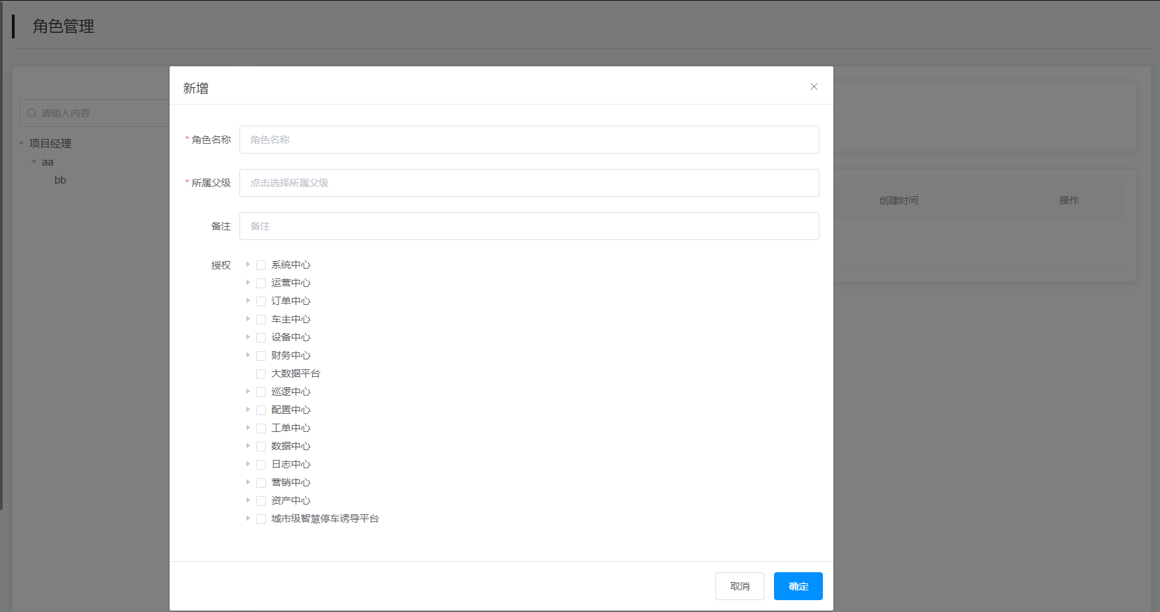 1.新增角色:点击“新增角色”按钮即可填写信息,选择父级即上属级别,并授权平台权限进行新增角色。