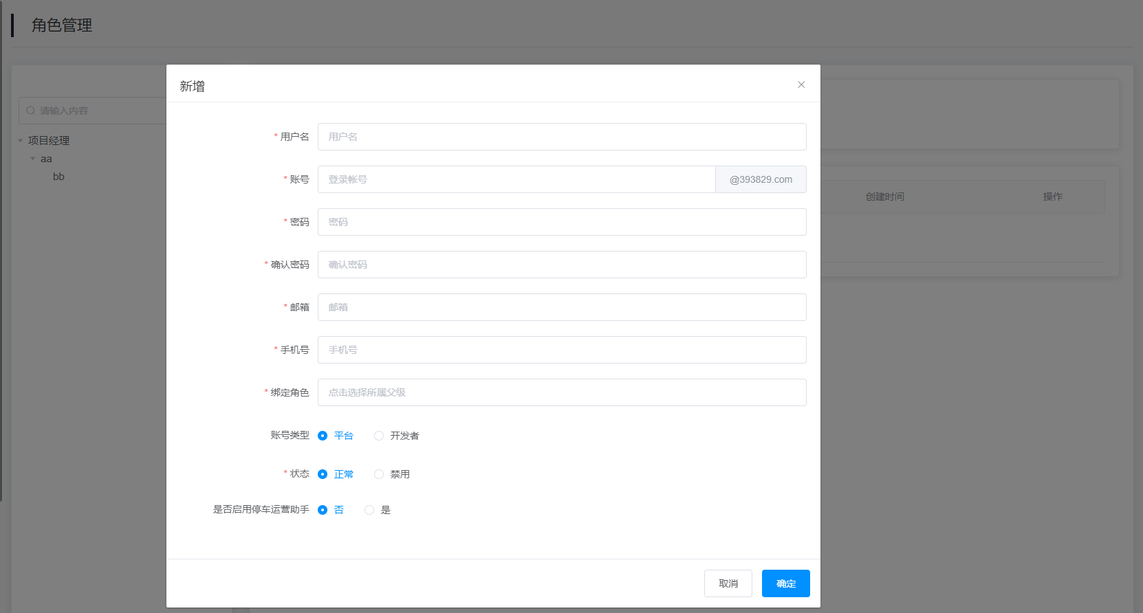 2.新增用户:点击查询内容右侧的“新增”按钮即可填写信息,绑定角色(选择所属父级),并授权平台权限进行新增用户账号。