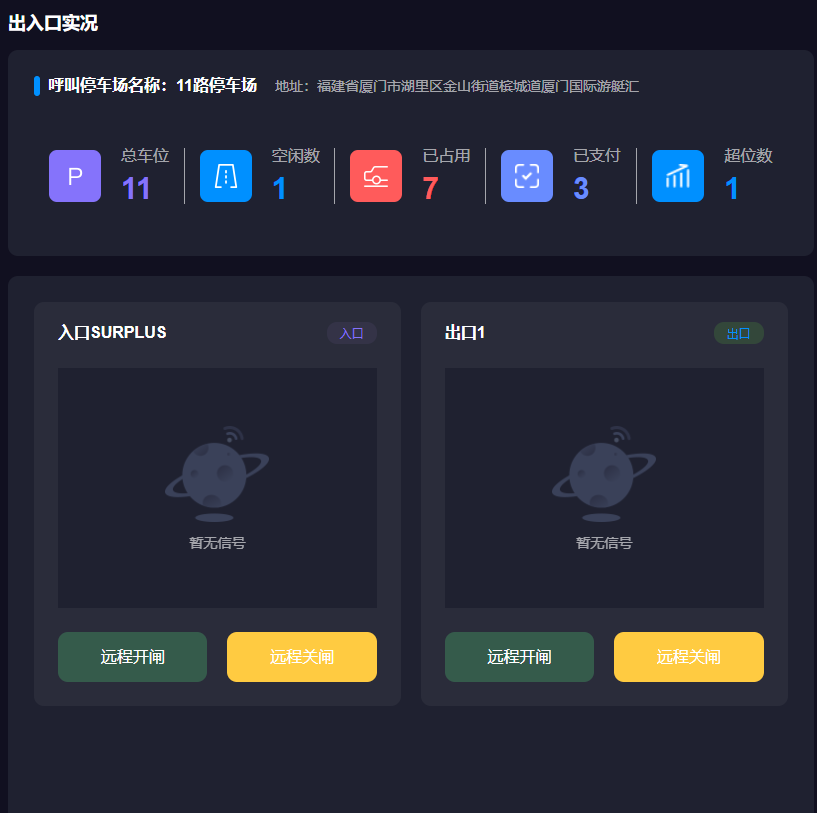 3.出入口实况:该出入口实况实时显示该停车场总车位、空闲数、已占有、已支付、超位数,并可以远程开关闸。