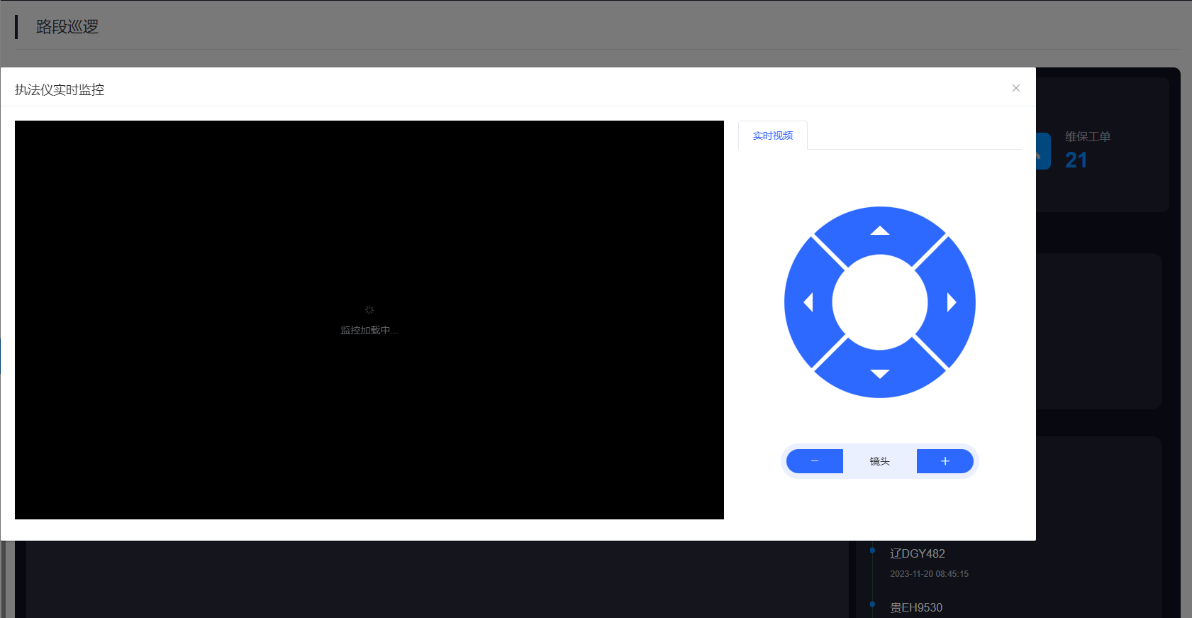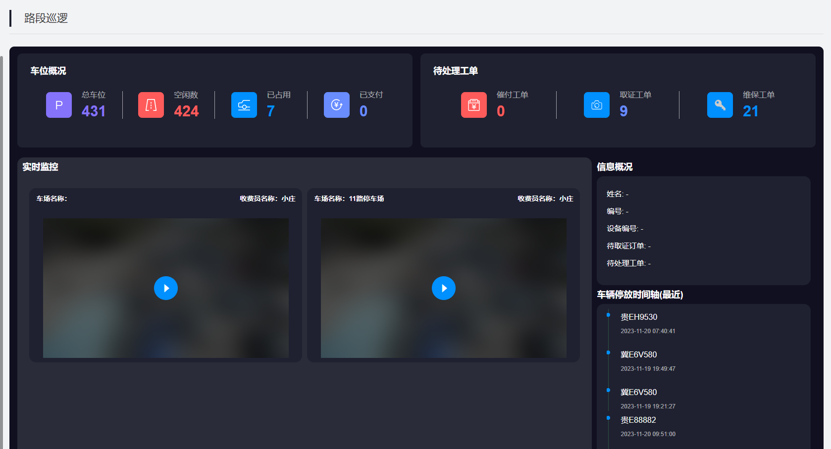 可以在路段巡逻上查看车位实时概况、待处理工单实时监控,负责路段收费员信息实时概况、车辆最近停放时间轴。