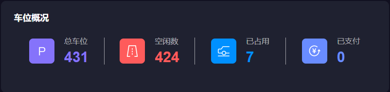 1.车位概况:该车位概况由总车位、空闲数、已占有、已支付组成。