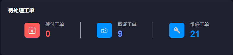 2.待处理工单:该待处理工单由催付工单、取证工单、维保工单组成。