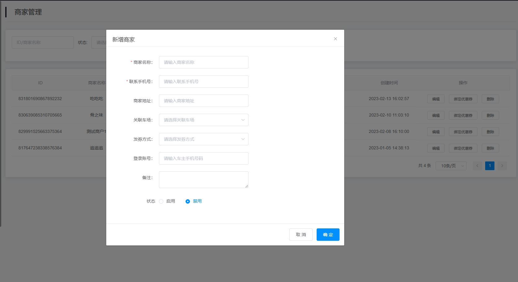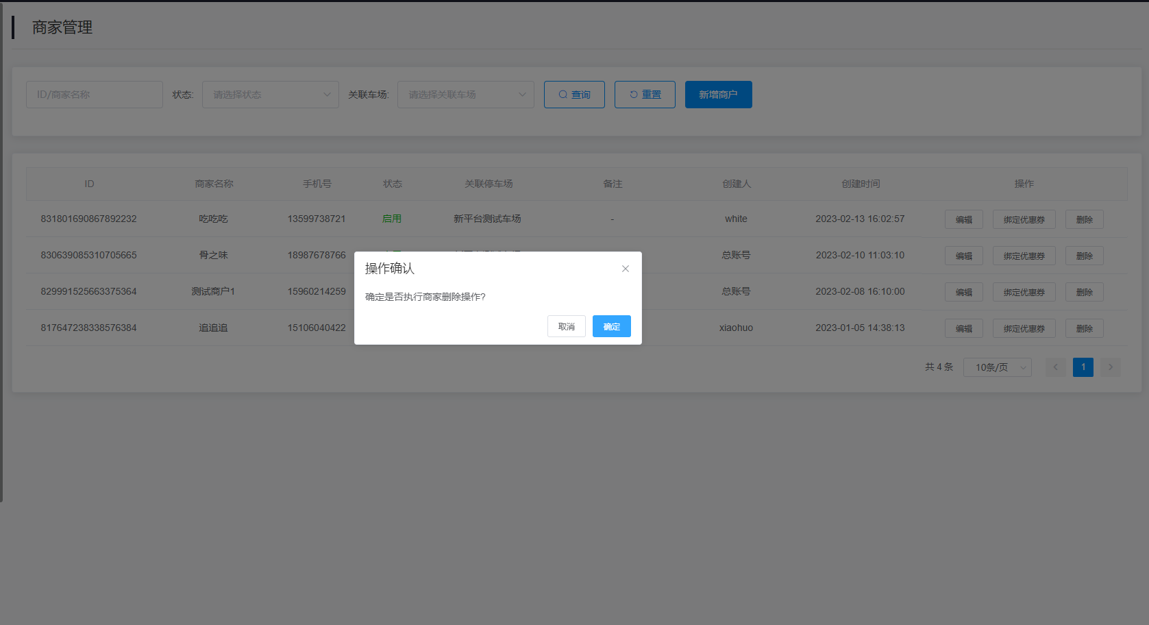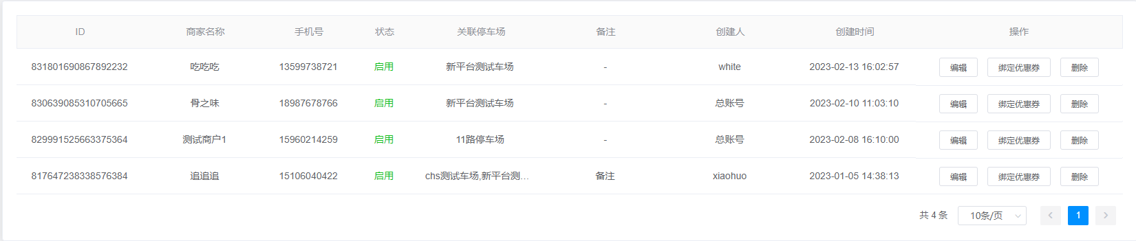 2.该查询结果由ID、商家名称、手机号、状态、关联车场、备注、创建人、创建时间、操作组成。通过查询条件进行筛查商家管理信息查找。