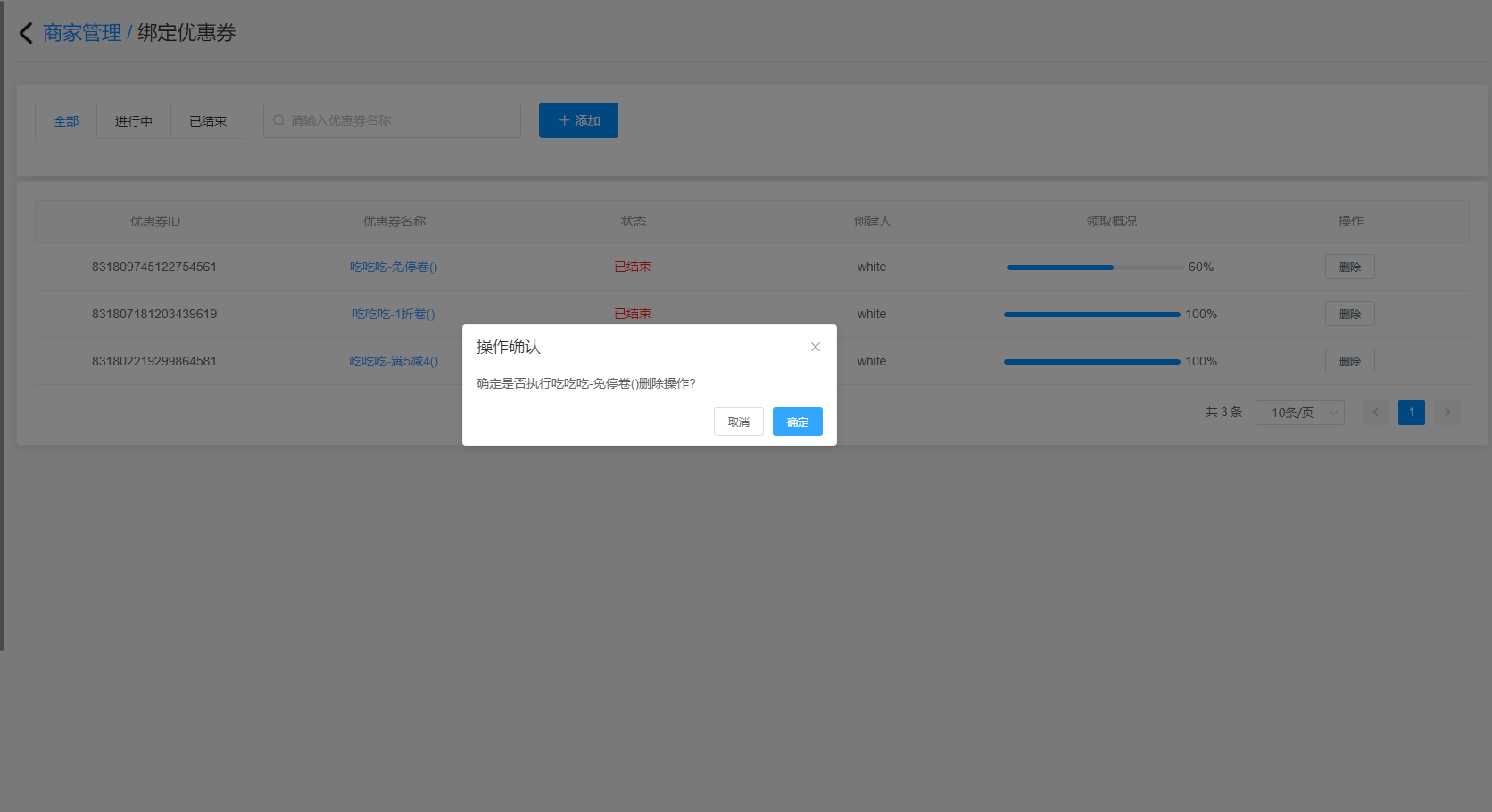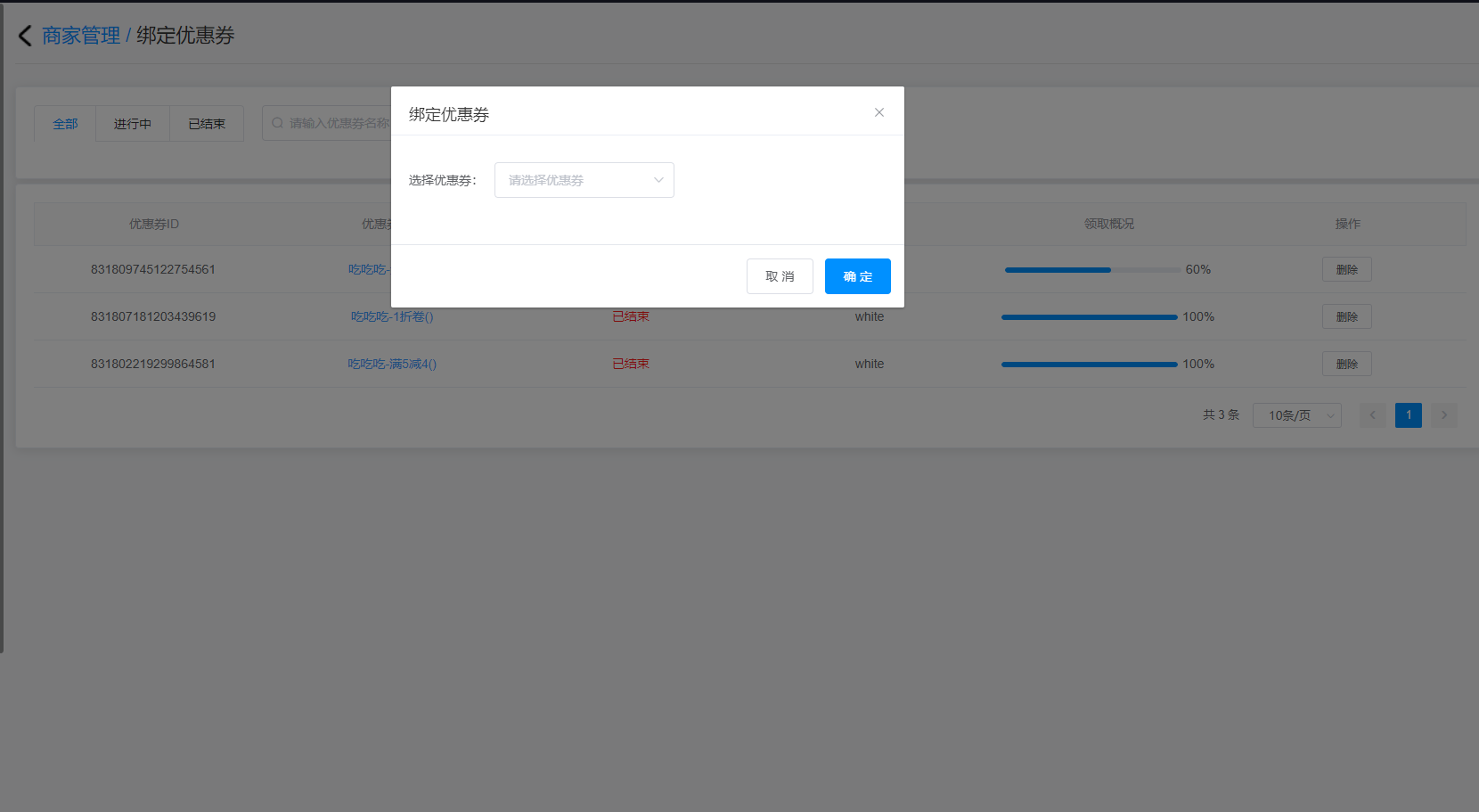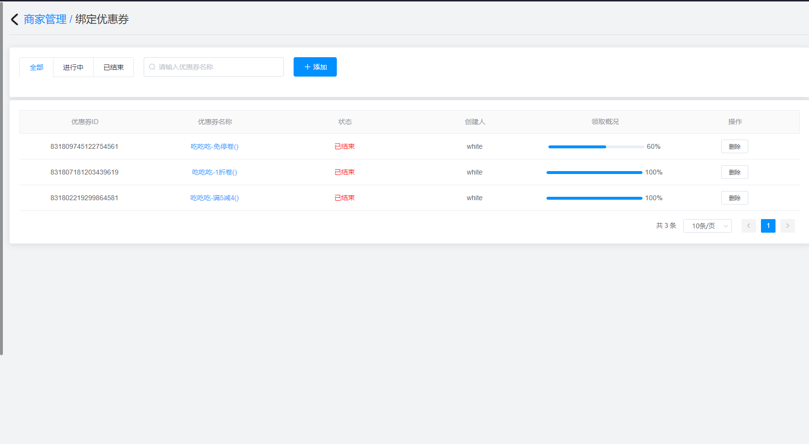 绑定优惠券:点击查询结果右侧的“绑定优惠券”按钮可以进入该商家的绑定优惠券。在绑定优惠券页面可以通过选择优惠券状态筛选优惠券或输入优惠券名称筛选优惠券;点击搜索框旁的“添加”按钮可绑定优惠券;点击查询结果右侧的“删除”按钮可确定是否执行优惠券删除操作。