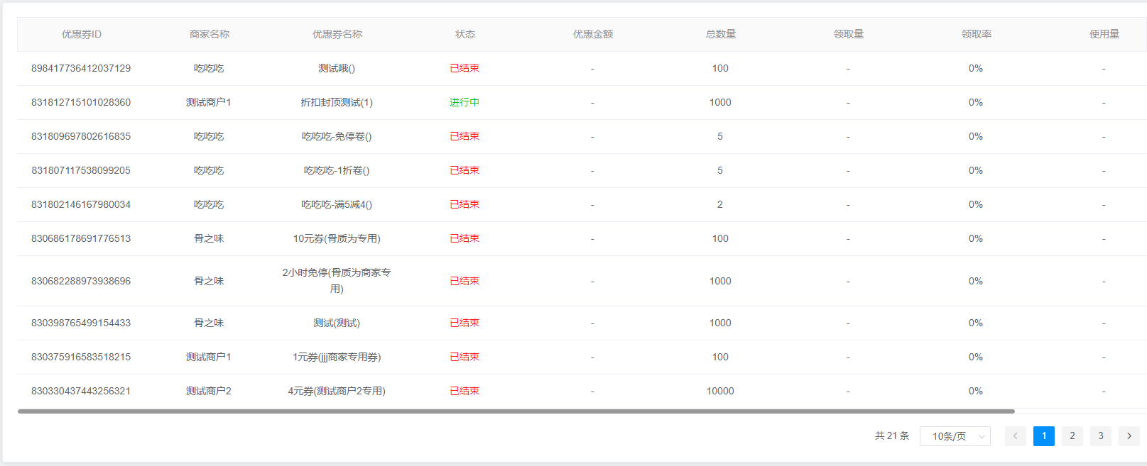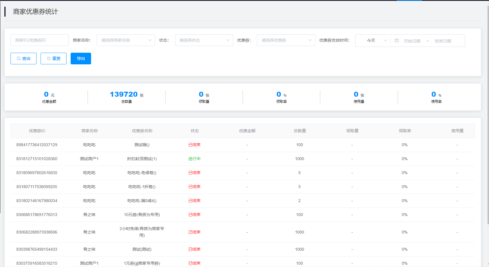 3.查询结果:该查询结果由优惠券ID、商家名称、优惠券名称、状态、优惠金额、总数量、领取量、领取率、使用量组成。通过查询条件进行筛查优惠券信息查找。