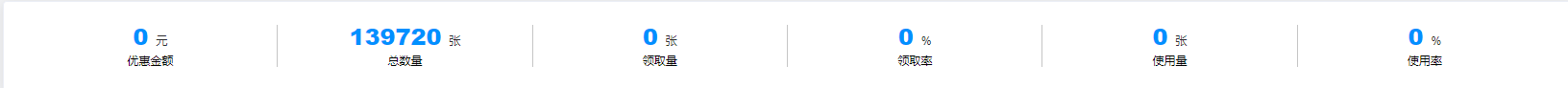 2.数据统计概况:该数据统计分别为优惠金额、优惠券总数量、优惠券领取量、优惠券领取率、优惠券使用量、优惠券使用率。