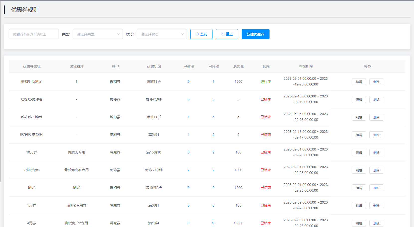 可以在优惠券规则上查询、筛选、编辑、删除到所有优惠券历史领取、使用详情。