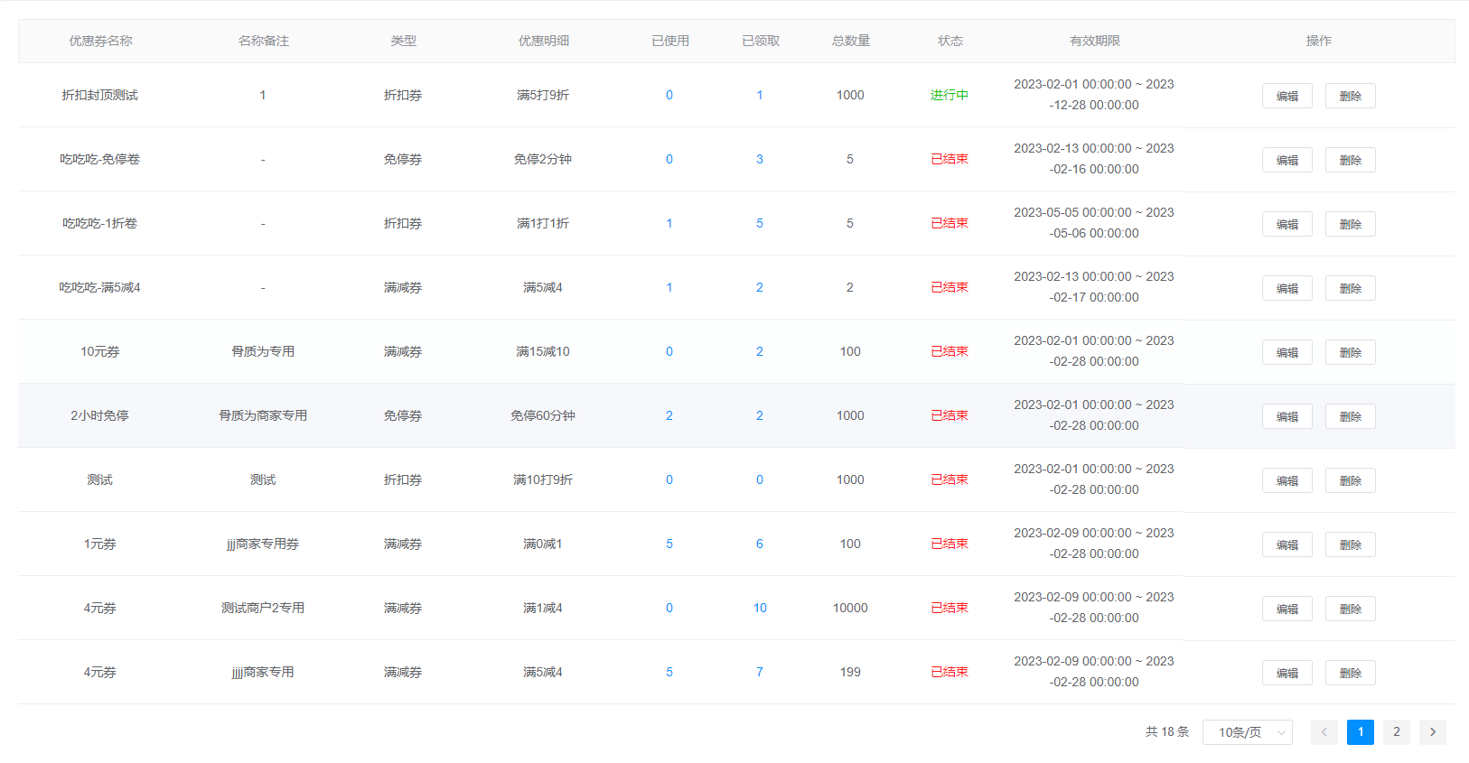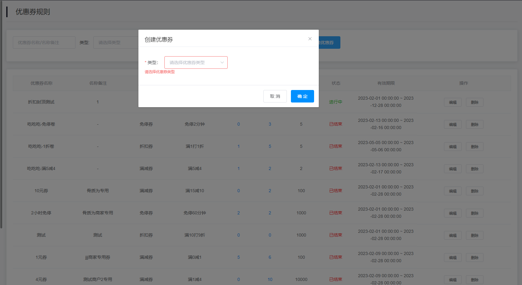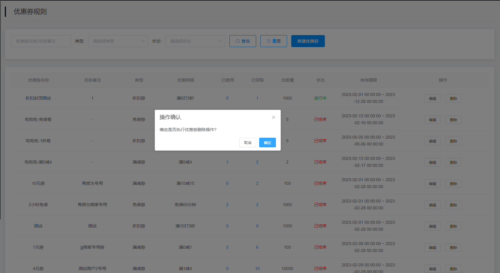 删除:点击查询结果右侧的“删除”按钮可以确认是否执行优惠券删除操作。