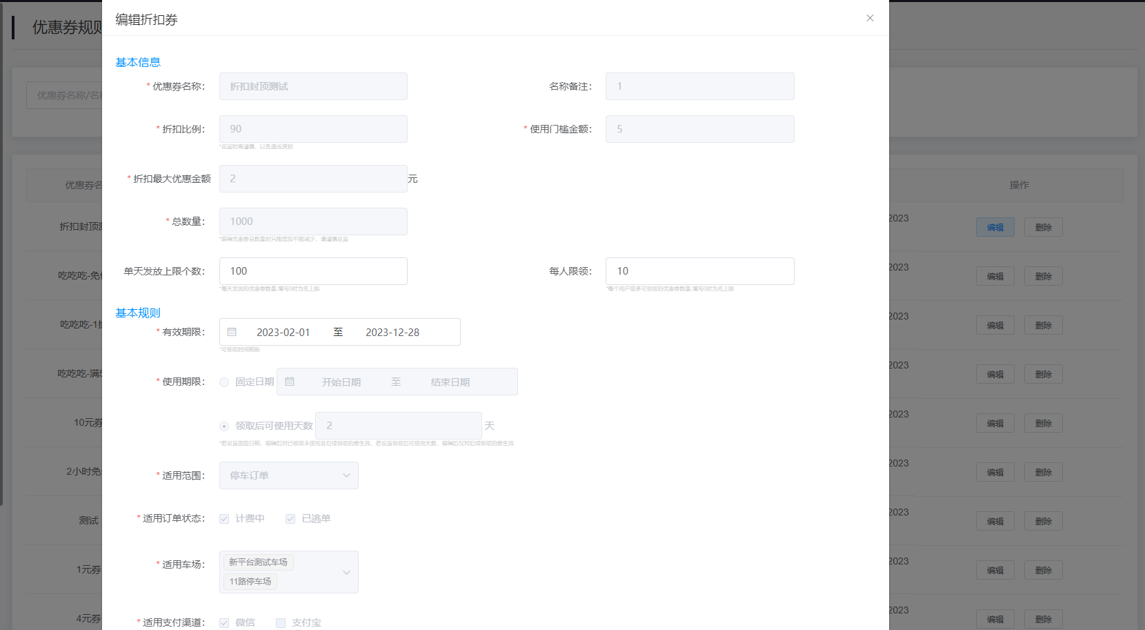 编辑:点击查询结果右侧的“编辑”按钮可以编辑该优惠券规则的基本信息、基本规则、样式信息。