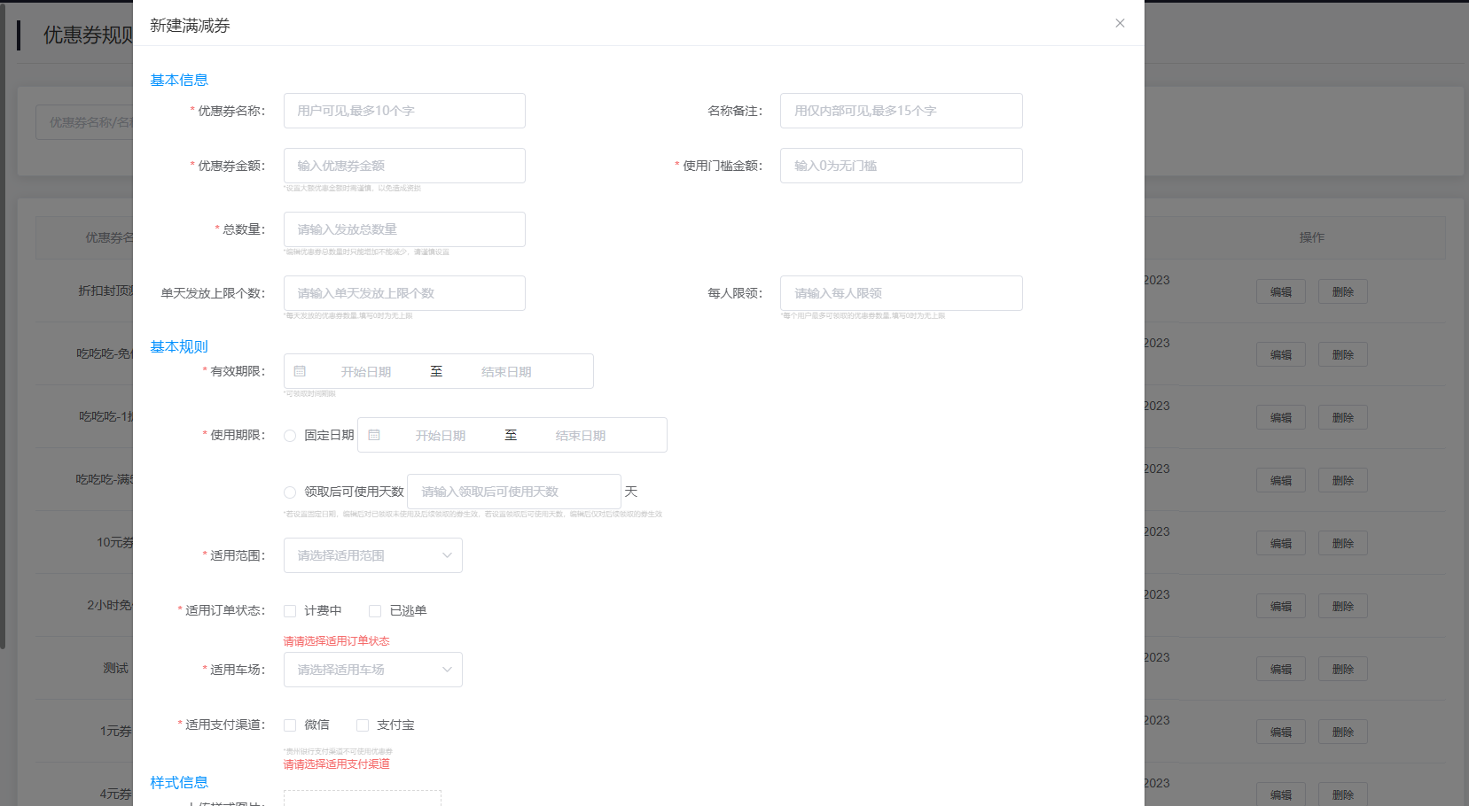 4.新建优惠券:点击查询内容右侧的“新建优惠券”按钮即选择新建优惠券类型,点击“确定”按钮即可填写新建优惠券的基本信息、基本规则、样式信息。