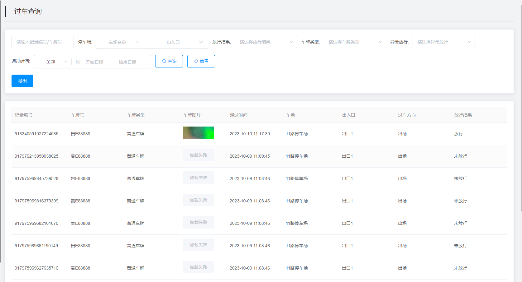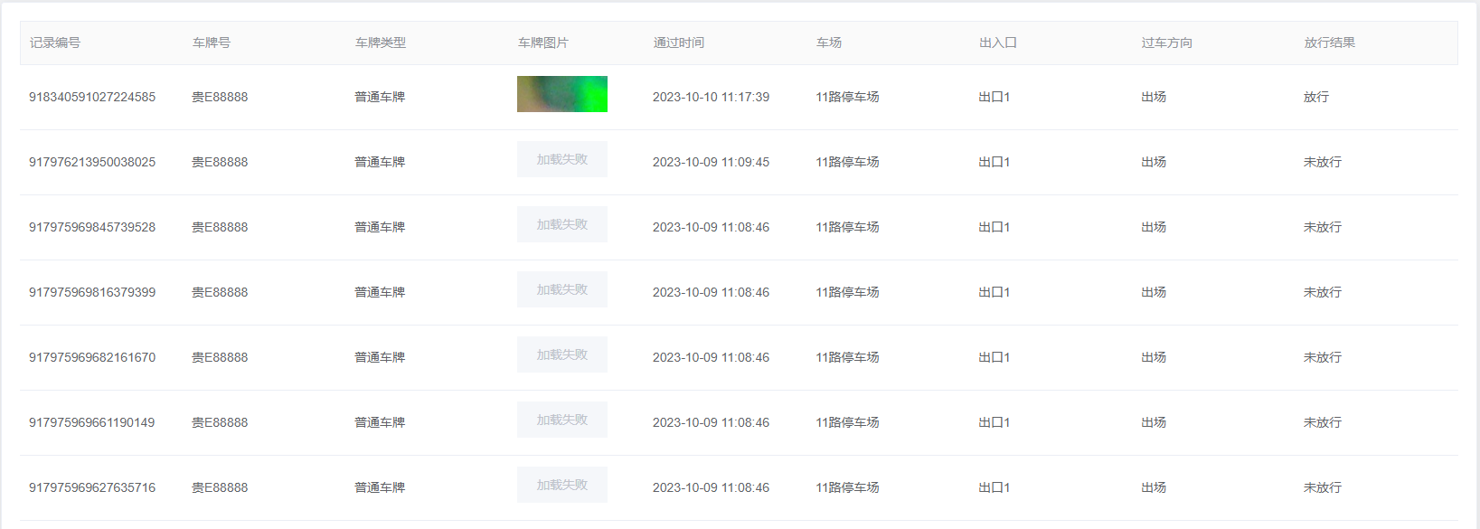 2.查询结果:该查询结果由记录编号、车牌号、车牌类型、车牌图片、通过时间、车场、出入口、过车方向、放行结果组成。通过查询条件进行筛查订单信息。
