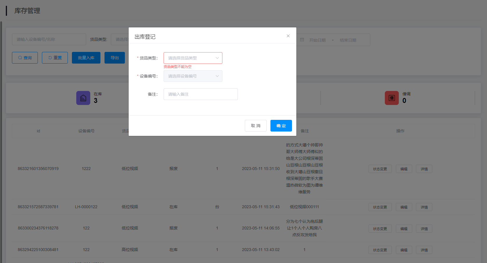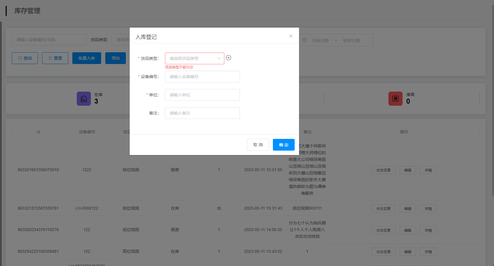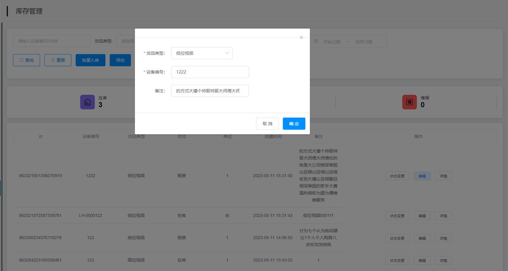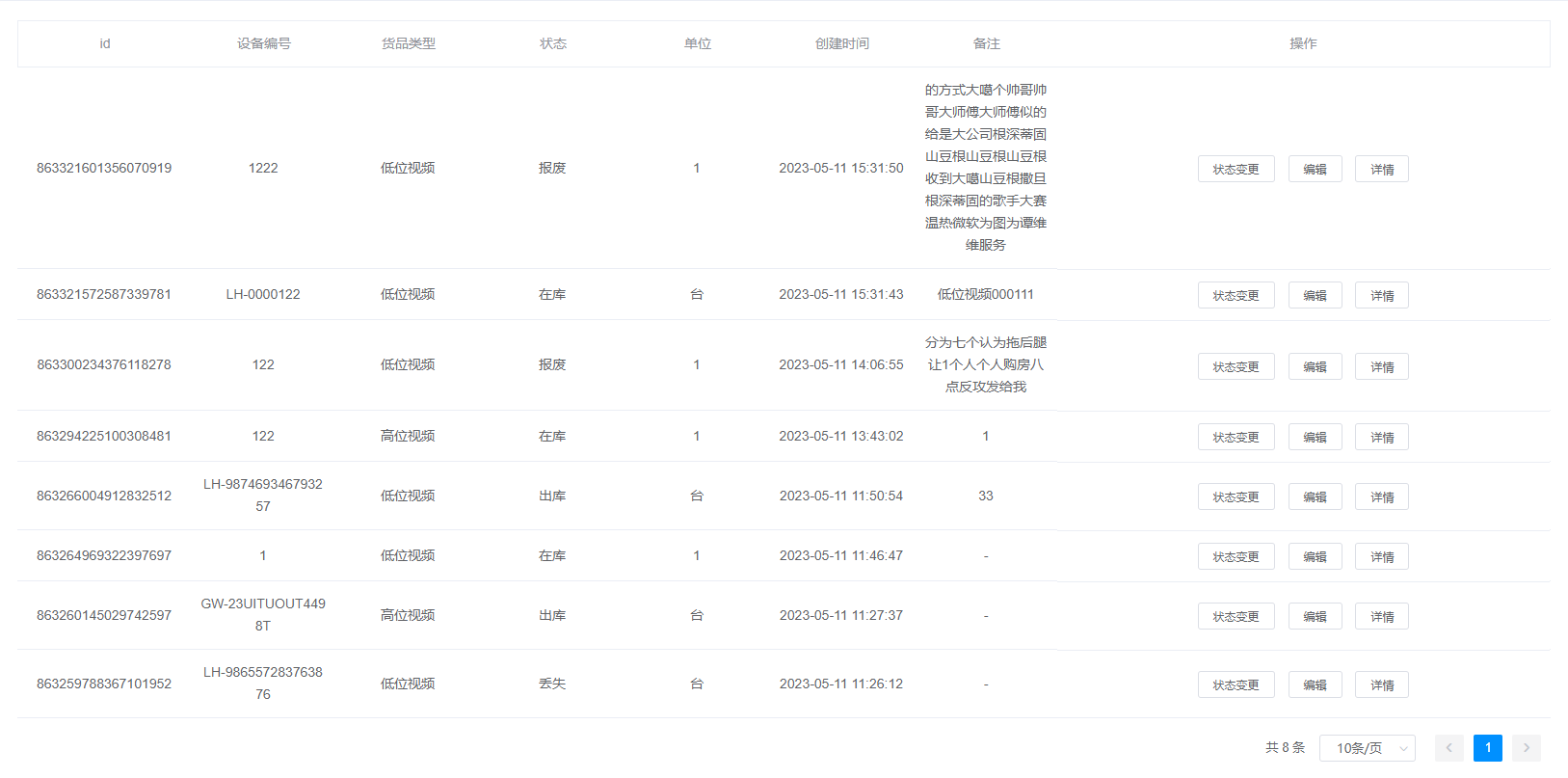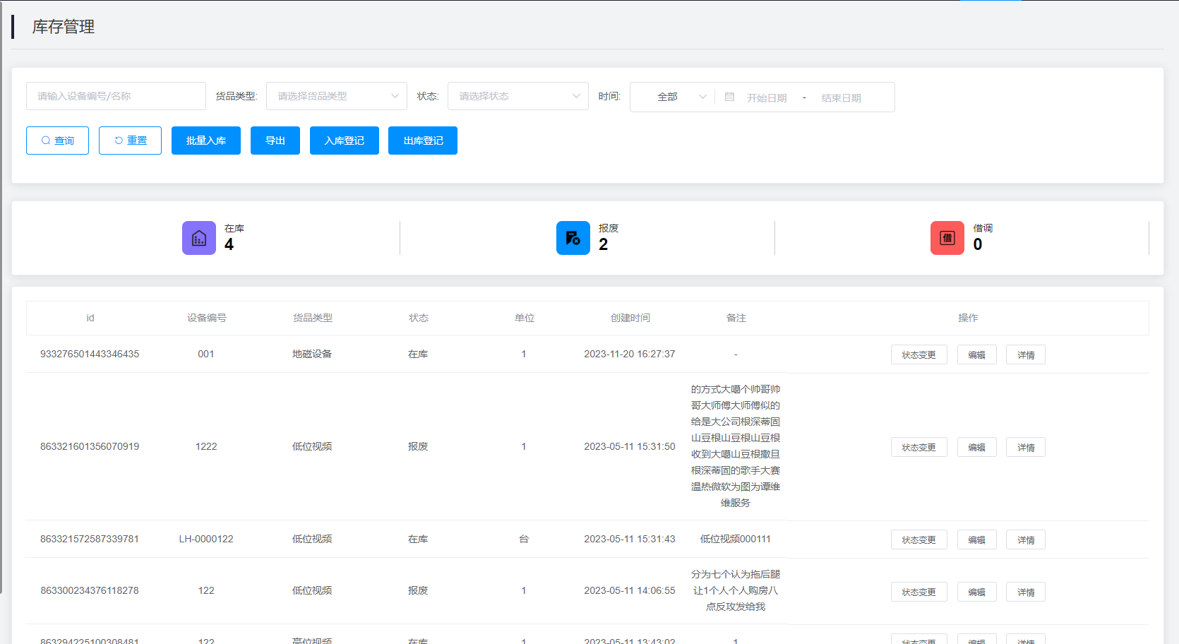 3.查询结果:该查询结果由id、设备编号、货品类型、状态、单位、创建时间、备注、操作组成。通过查询条件进行筛查在库设备信息查找。