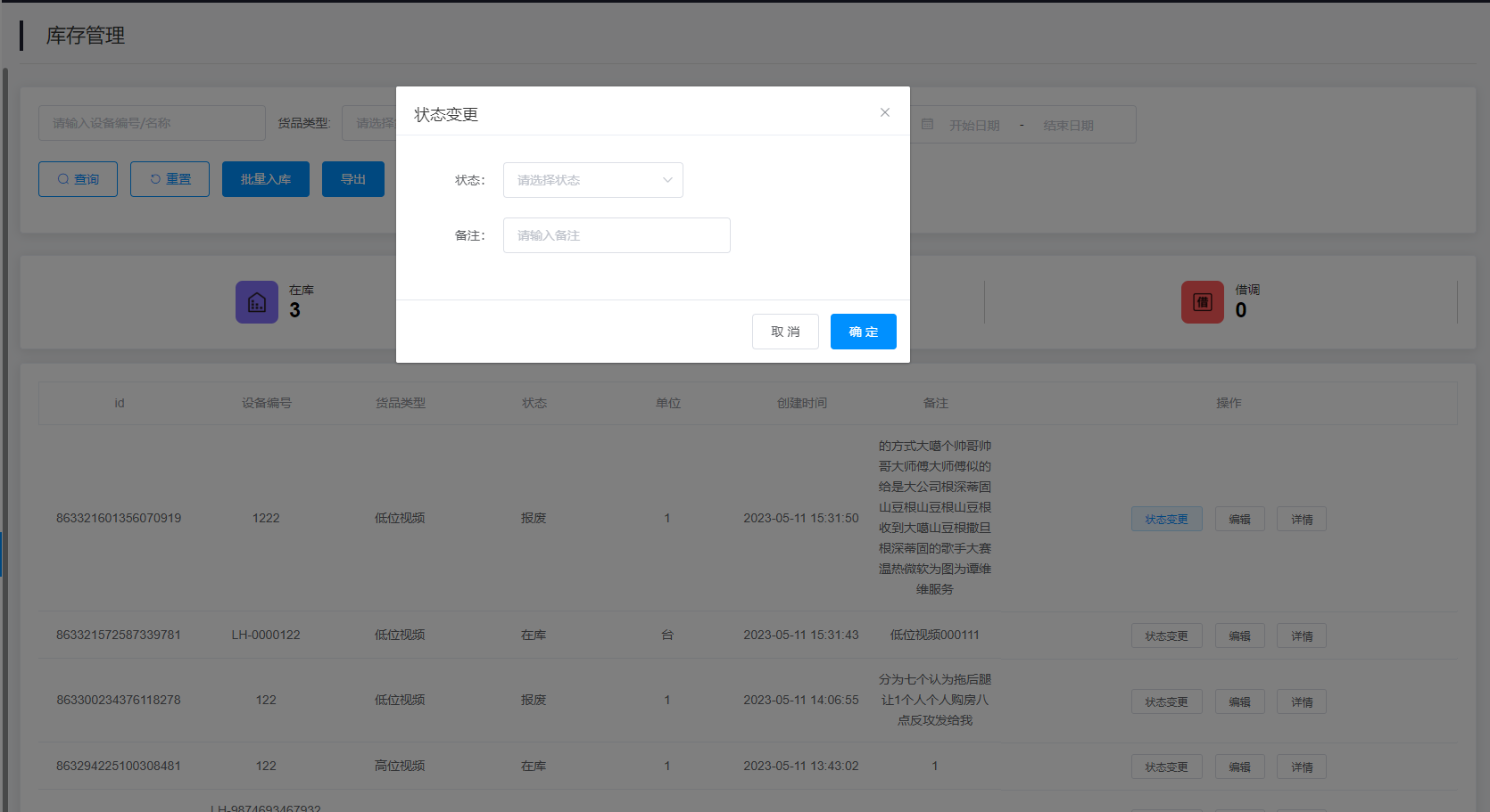 状态变更:点击查询结果右侧的“状态变更”按钮可以重新选择该设备状态以及填写备注。
