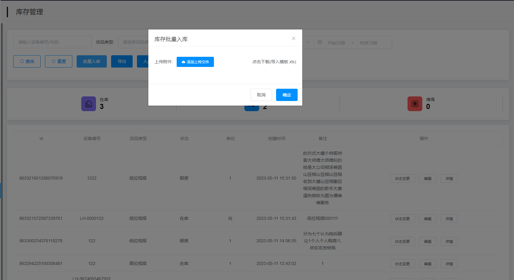 5.批量入库:点击查询内容的“批量入库”按钮即可上传文件库存批量入库。